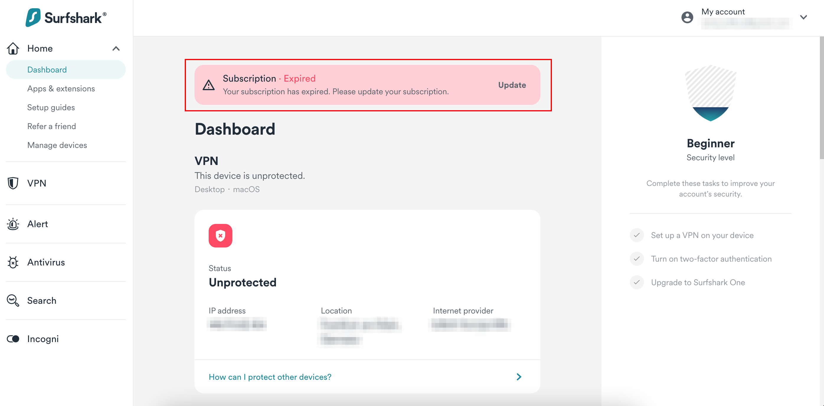 - You have just successfully created a Surfshark account using Google or Apple. To order a subscription package, click Update.