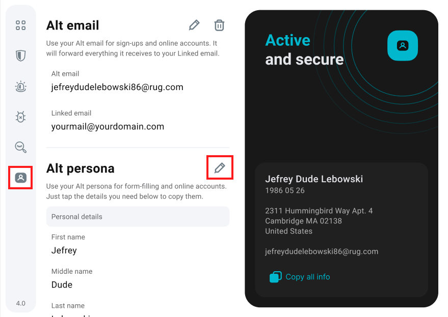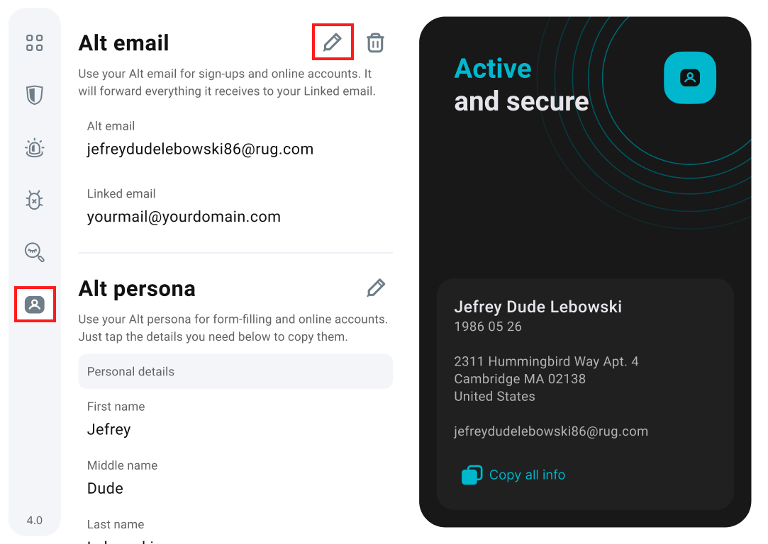 Open the Surfshark browser extension, click on the Alternative ID tab, and click on the pencil icon next to the Alt persona.
