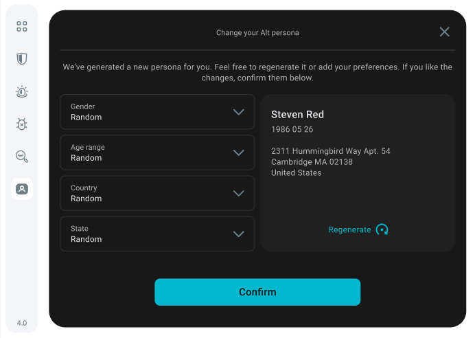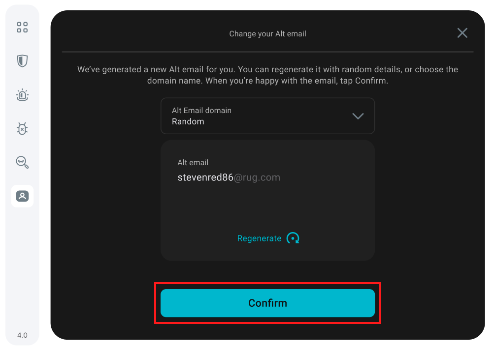 - In the next window, you will be introduced to your alternative email. You can either keep the generated one or regenerate a different one. Once you are happy with your Alt email, click Confirm.