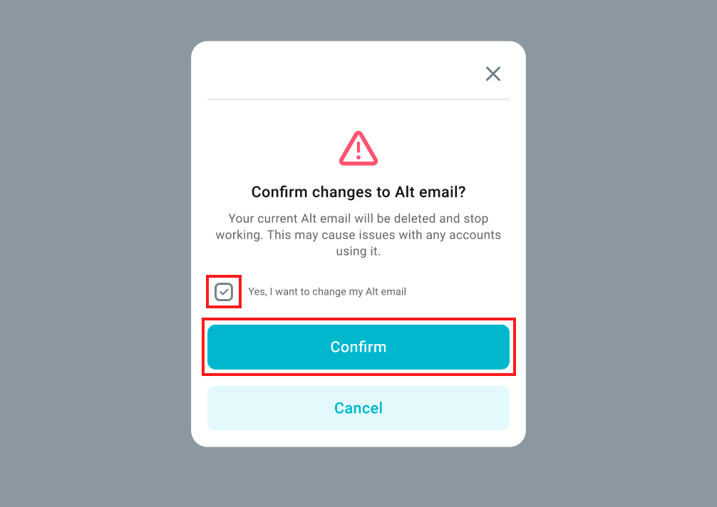 - Tick the box Yes, I want to change my Alt email and click Confirm.