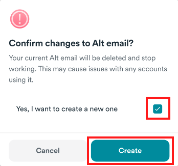 Once you are happy with the changes made, click Confirm changes. - If you have Regenerated the Alt email, you will get a confirmation box. Tick Yes, I want to create a new one and click Create.
