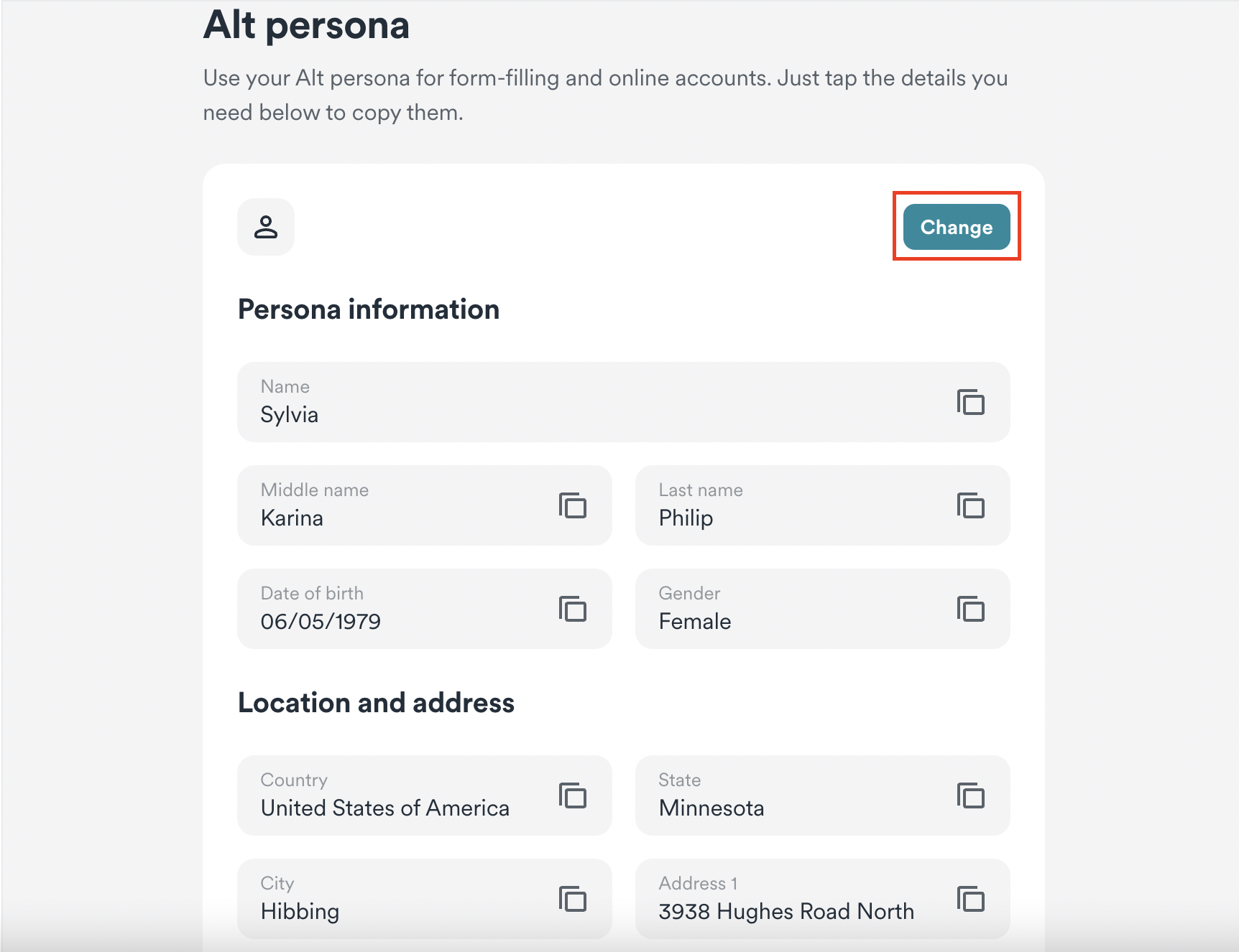 In your Surfshark account, go to the Alternative ID tab, scroll down, and click Change next to Alt persona.