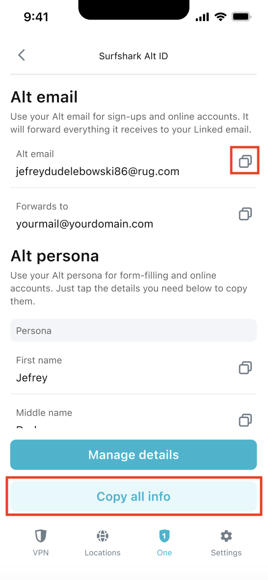 - Open the Surfshark browser extension, go to the Alternative ID tab, and click Copy all info on the right side of the window.