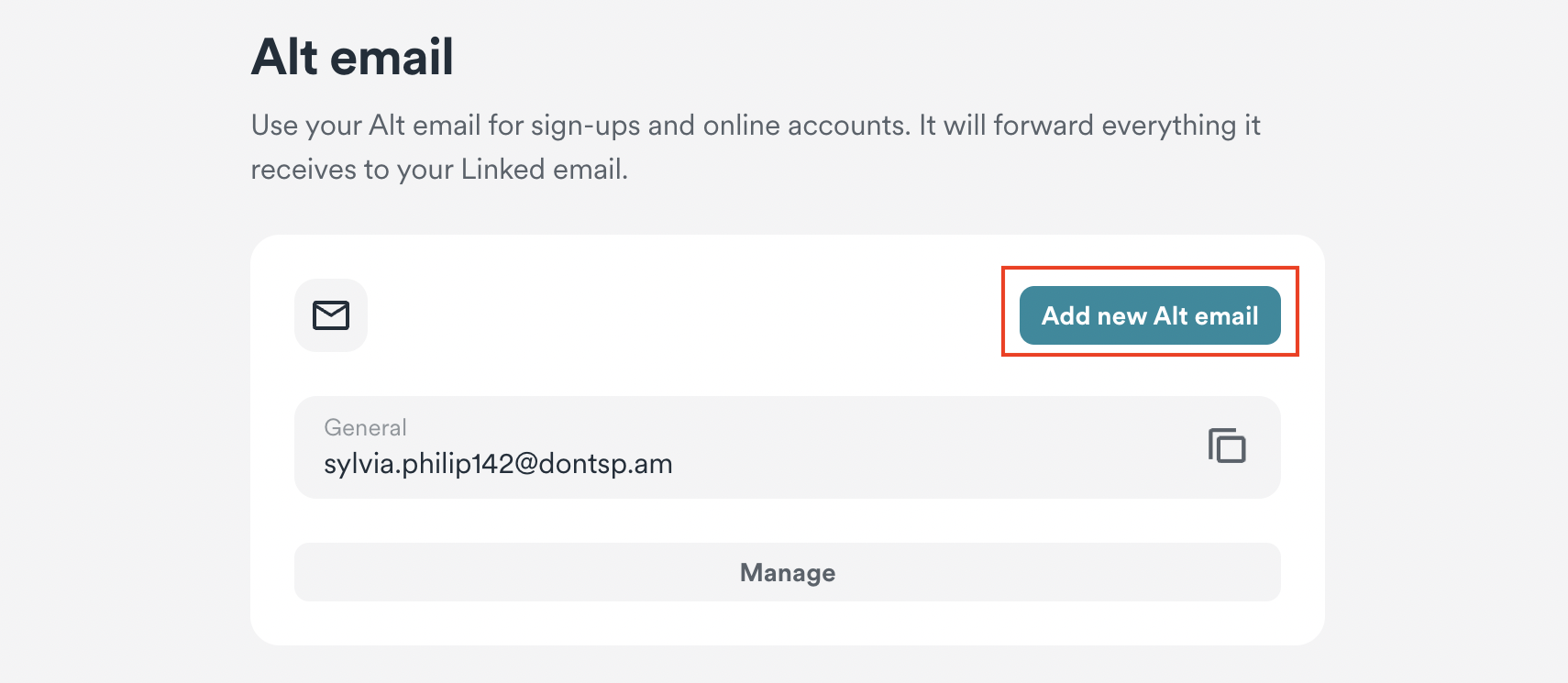 - With the most recent update, you can also create up to three alternative emails. First, press on Add new Alt email.