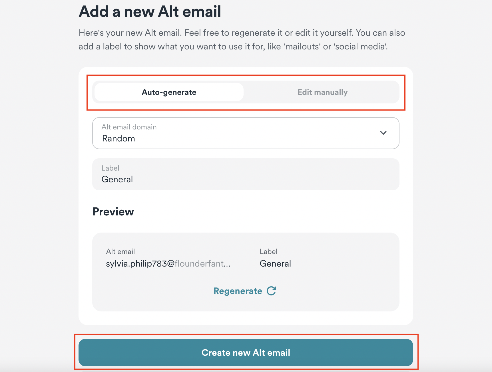 - Now, you will get an option to either Auto-generate it or you can Edit manually. Once done, press on Create new Alt email.