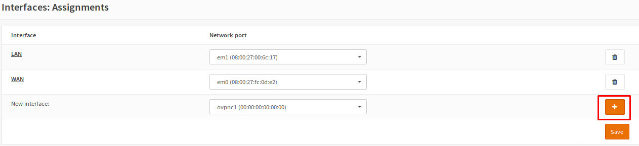 7. Navigate to Interfaces > Assignments and click on + near New Interface. By default, it should be ovpnc1.