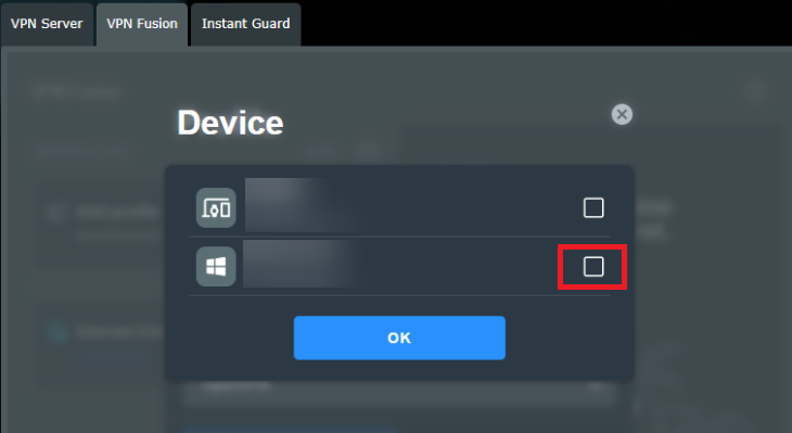 - A list of devices connected to your router will appear. Tick the box next to the devices that you wish to be affected by the VPN connection.
