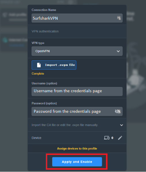 For the username and password, you must use the credentials generated in the Find your login details section. - Import the server configuration file by clicking on Import .ovpn file from the choose a Surfshark server section.