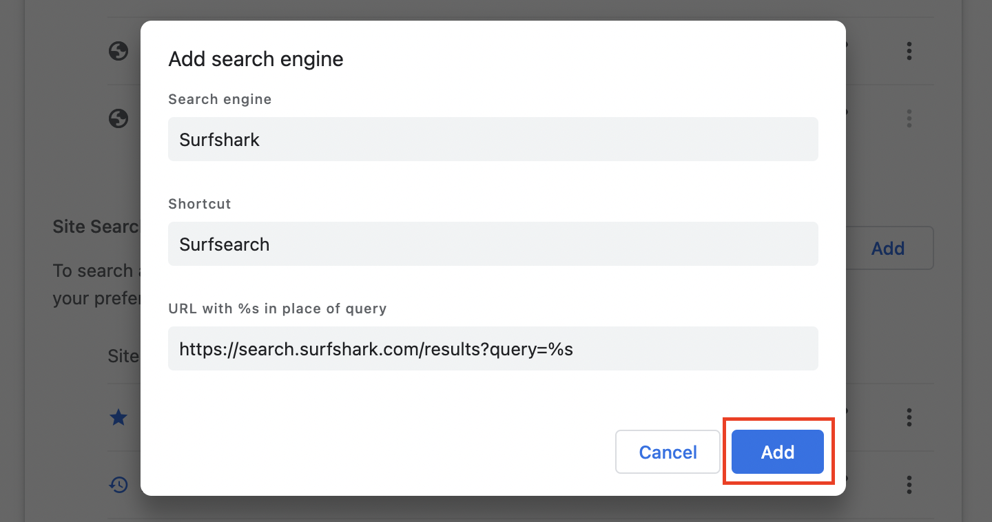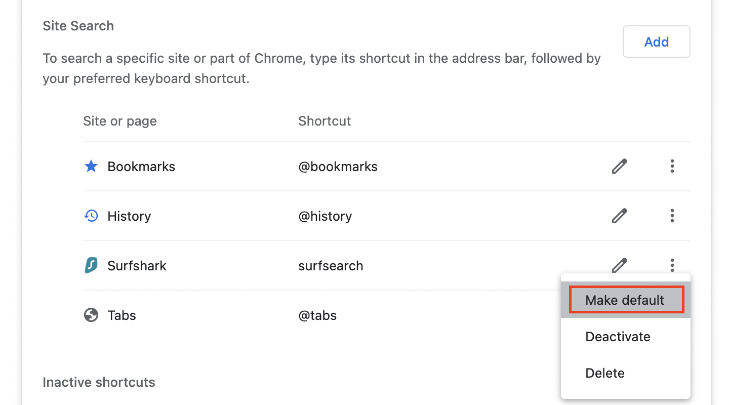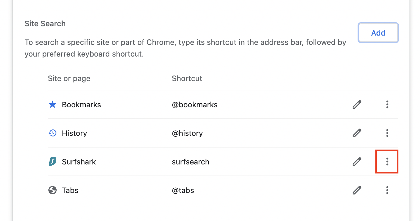 Once done, click on Add again. - Now, you'll be able to see Surfshark in the available search engine list. Click the three dots next to the Surfshark listing.