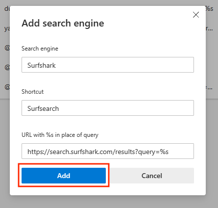 Once done, click on Add again. - Now, click the three dots next to the Surfshark Search listing.