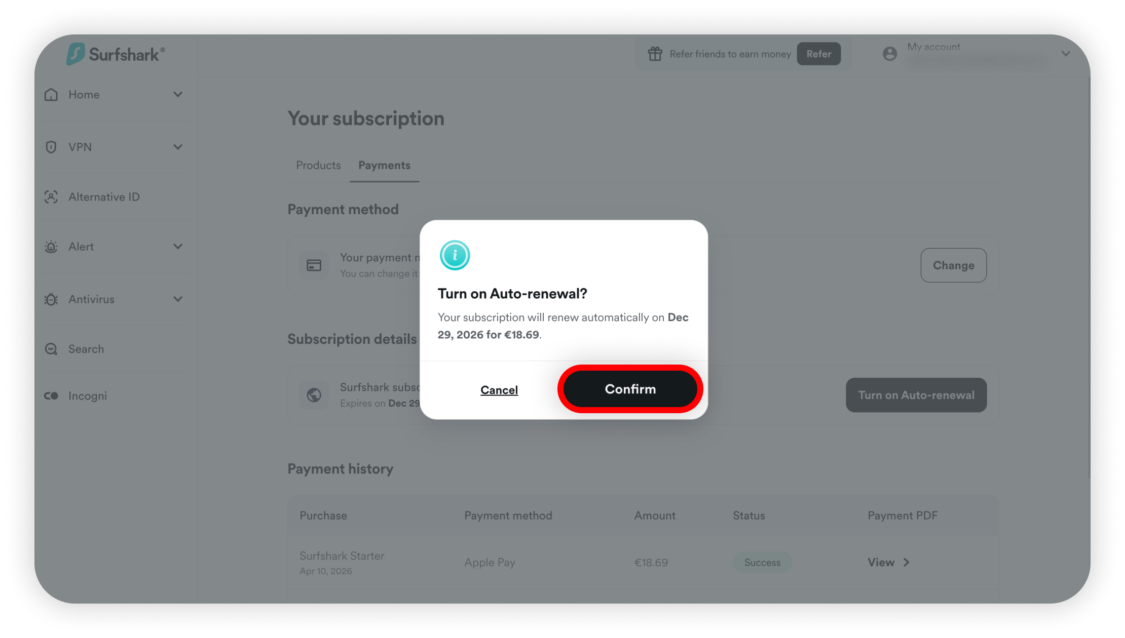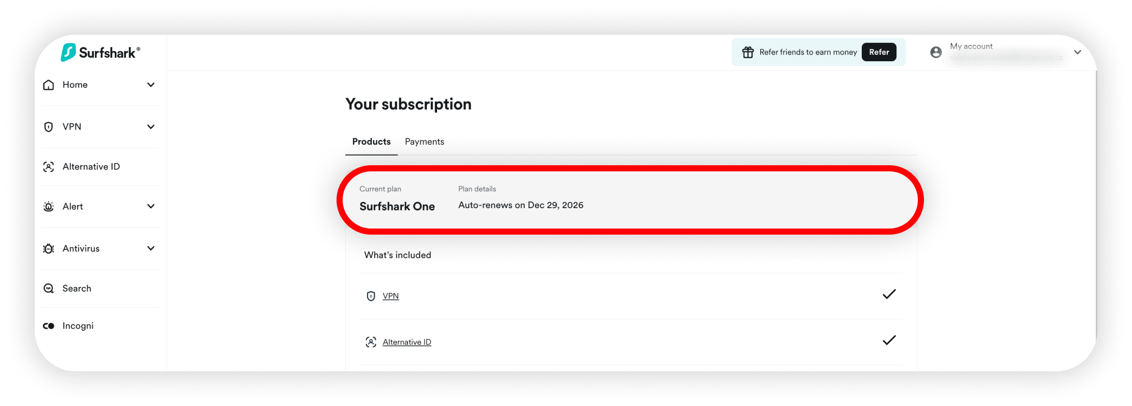 NOTE: Some management options may be unavailable in your Surfshark account if your subscription was purchased through a third‑party provider or a payment method that doesn’t support recurring payments.