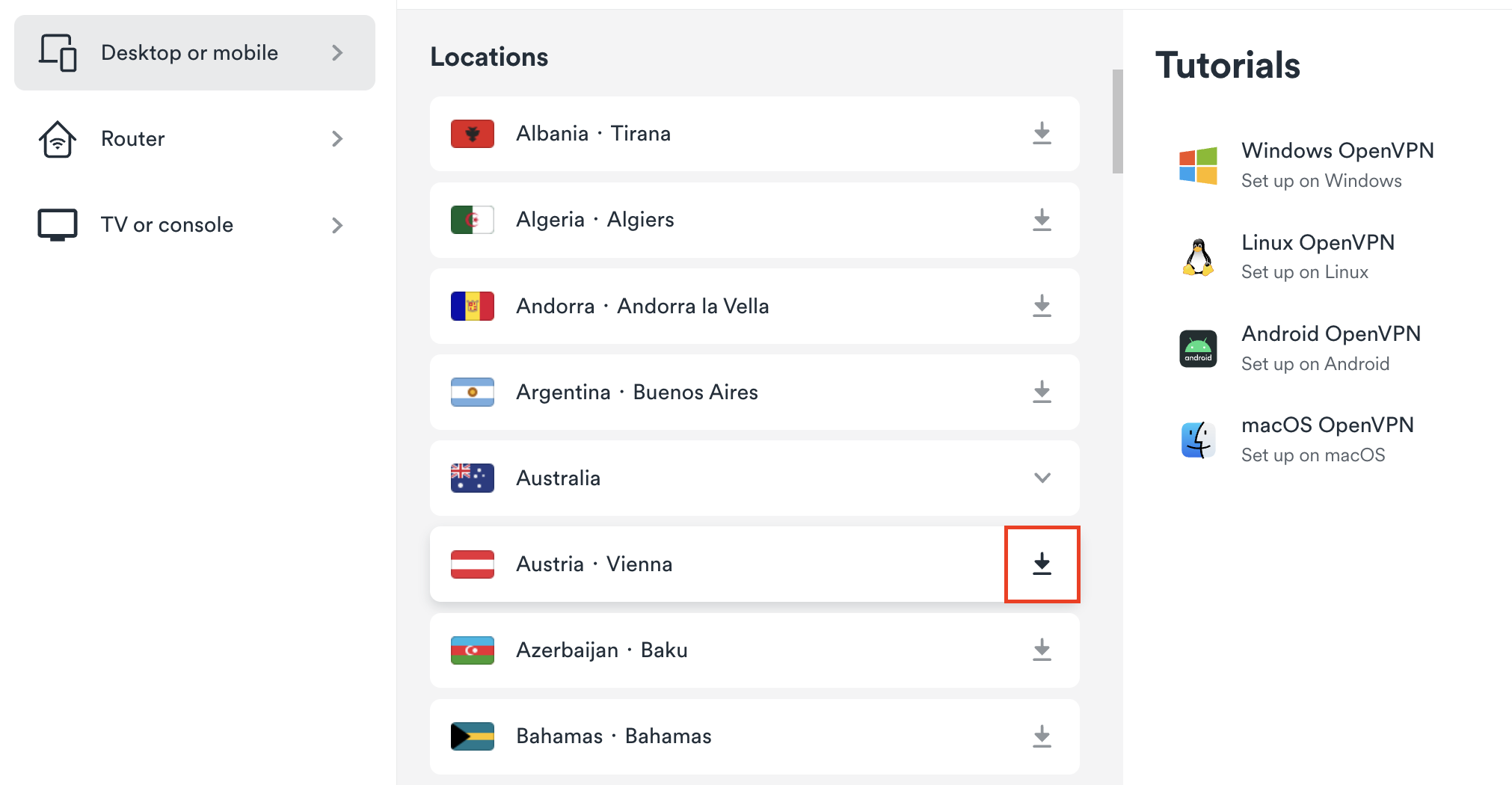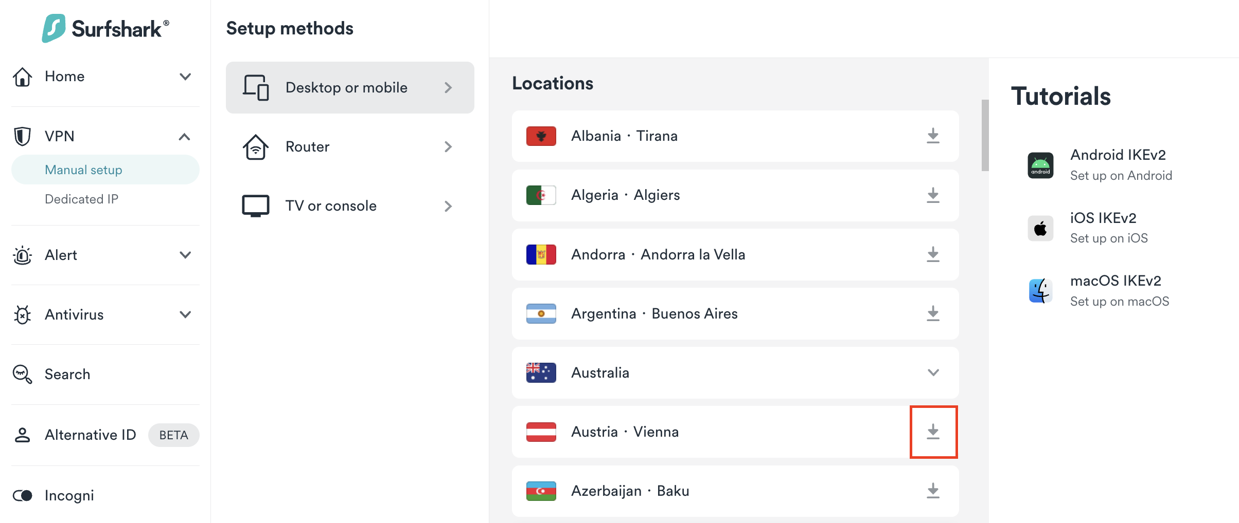 - Select a server of your choice and click the download icon next to it.