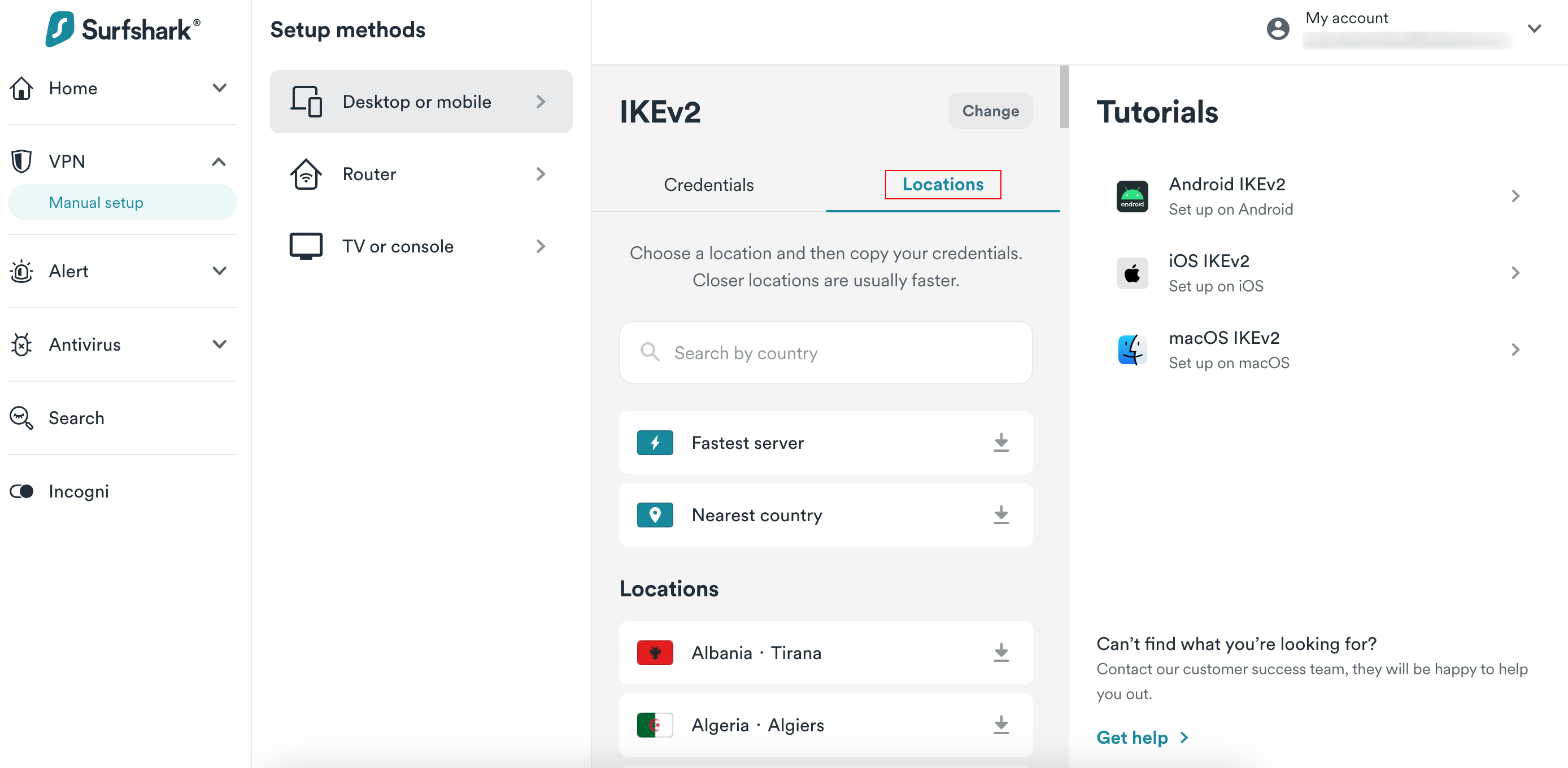 - Enter the Surfshark login page and log in. Then, click on VPN > Manual Setup > Desktop or mobile > IKEv2 to navigate to the Credentials tab.