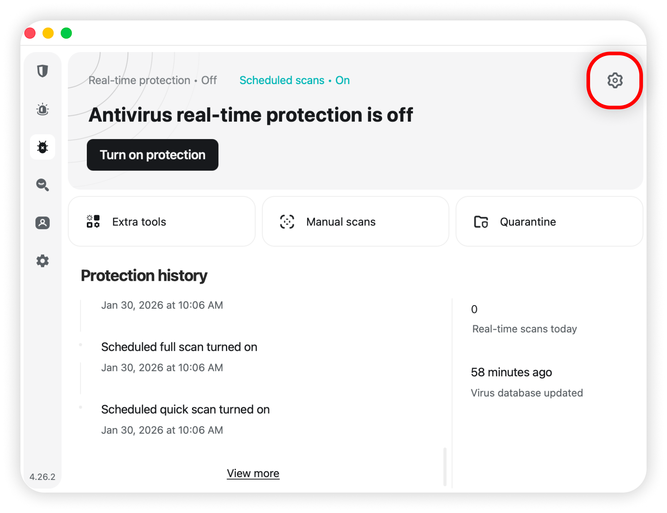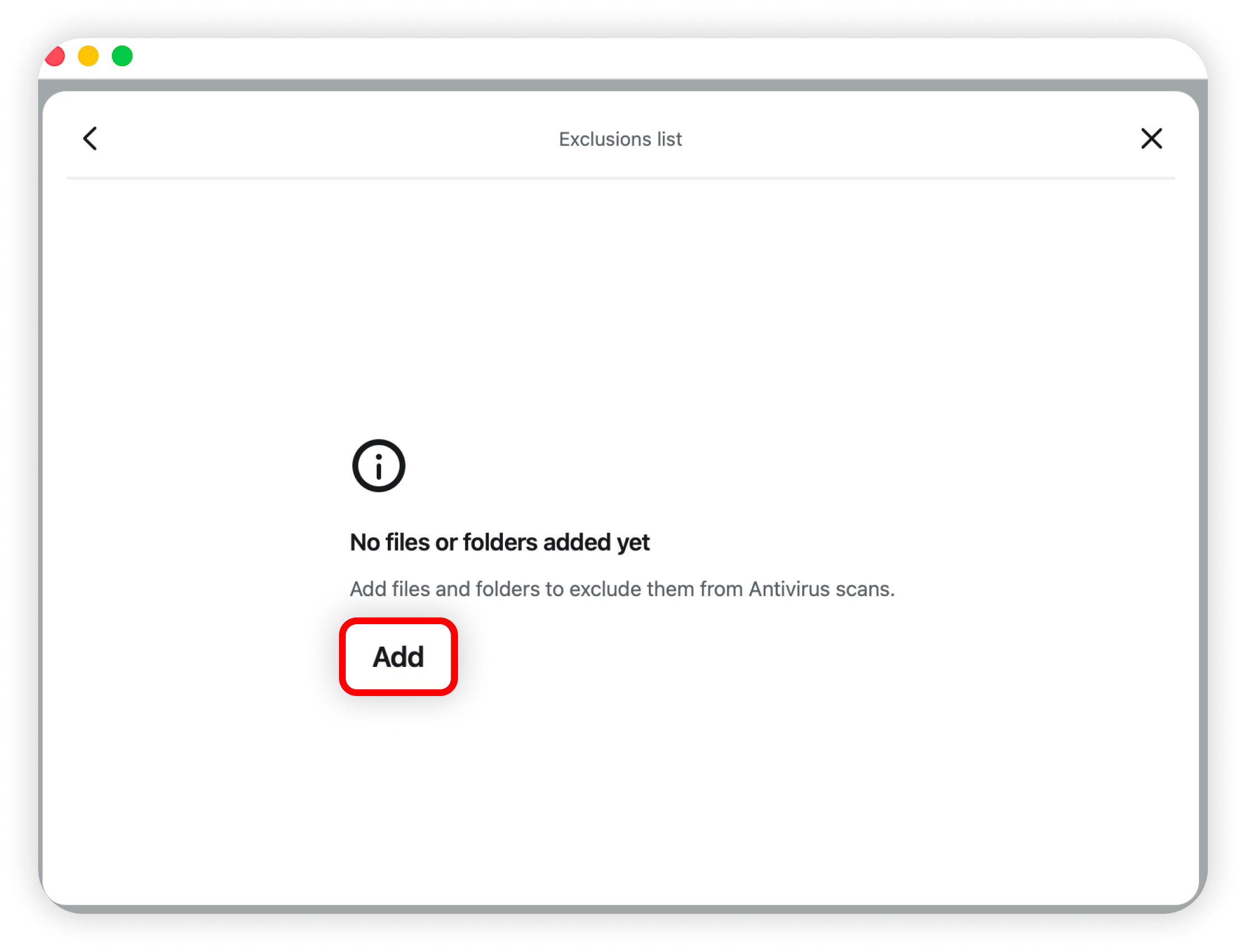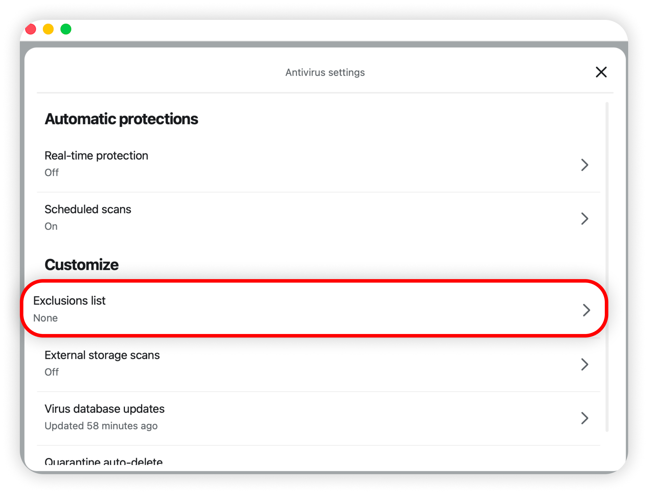 Occasionally, Surfshark Antivirus may block items that are necessary for your daily workflow. If this happens, you can add an exclusion to prevent trusted applications or files from being flagged as false positives. To set up an exclusion in Surfshark Antivirus on your macOS device, follow the steps below: