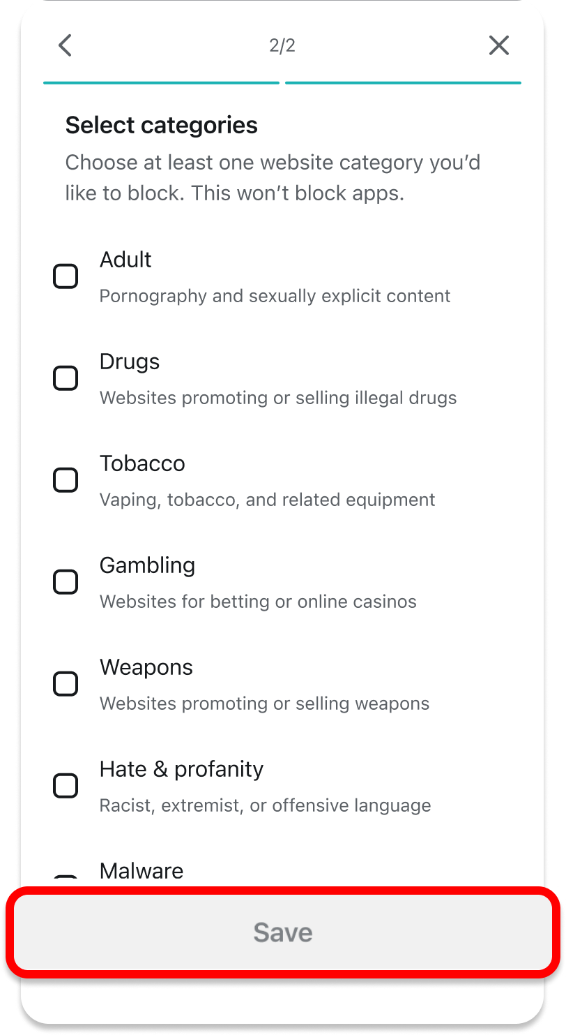 Select the categories you want to block by tapping the square next to them. Once done, tap Save.