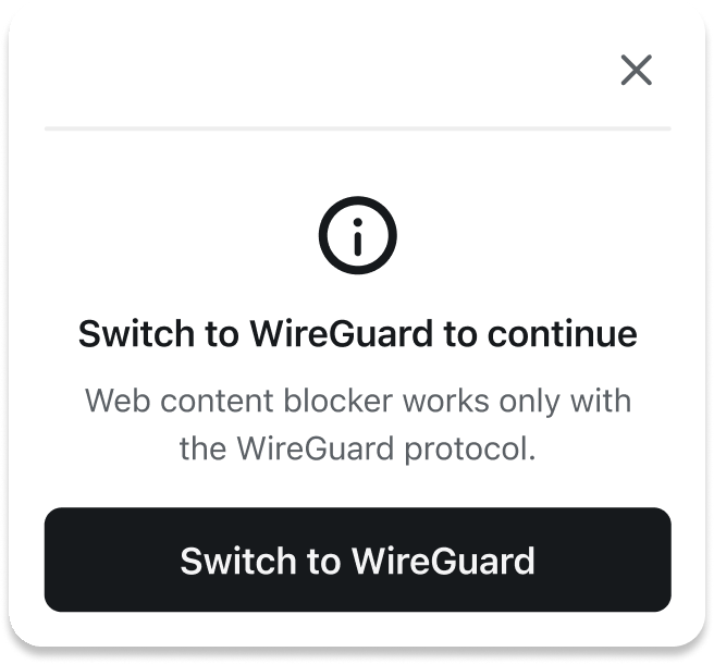 The web content blocker currently works without a VPN connection. However, if you want to stay connected to the VPN and use web content blocker, you must use the WireGuard® protocol. If your Surfshark VPN is connected using another protocol (like IKEv2 or OpenVPN), the web content blocker will not function. Reconnect your VPN and ensure that you are using WireGuard® as your protocol.