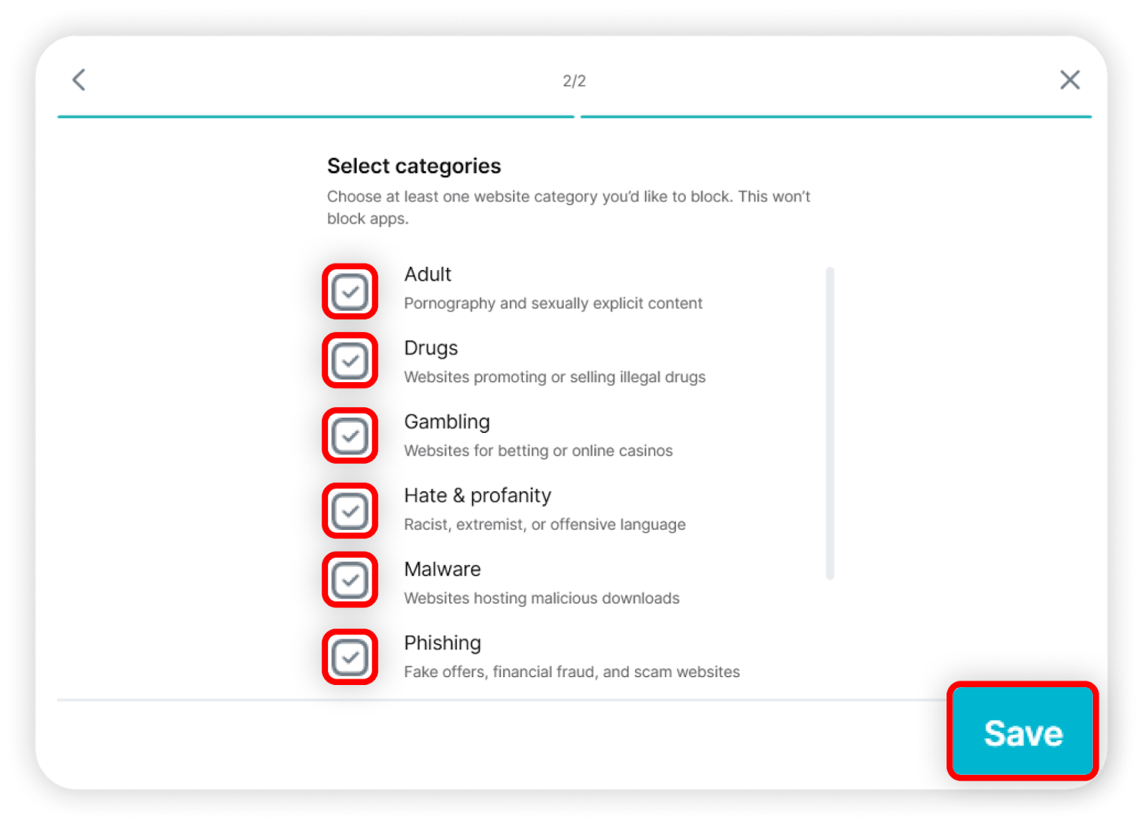 5. Select the content categories you want to block by checking the relevant boxes, then click Save: