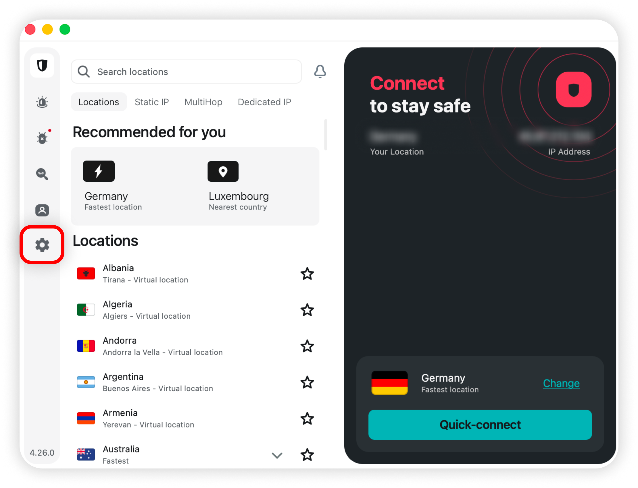 1. Open the Surfshark app and click the cogwheel icon in the left-side menu to open Settings: