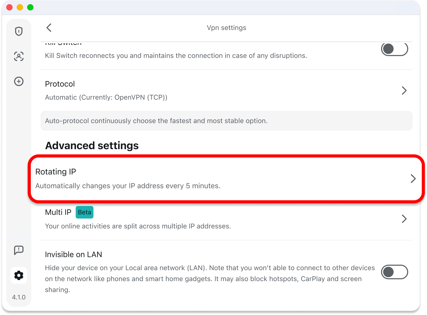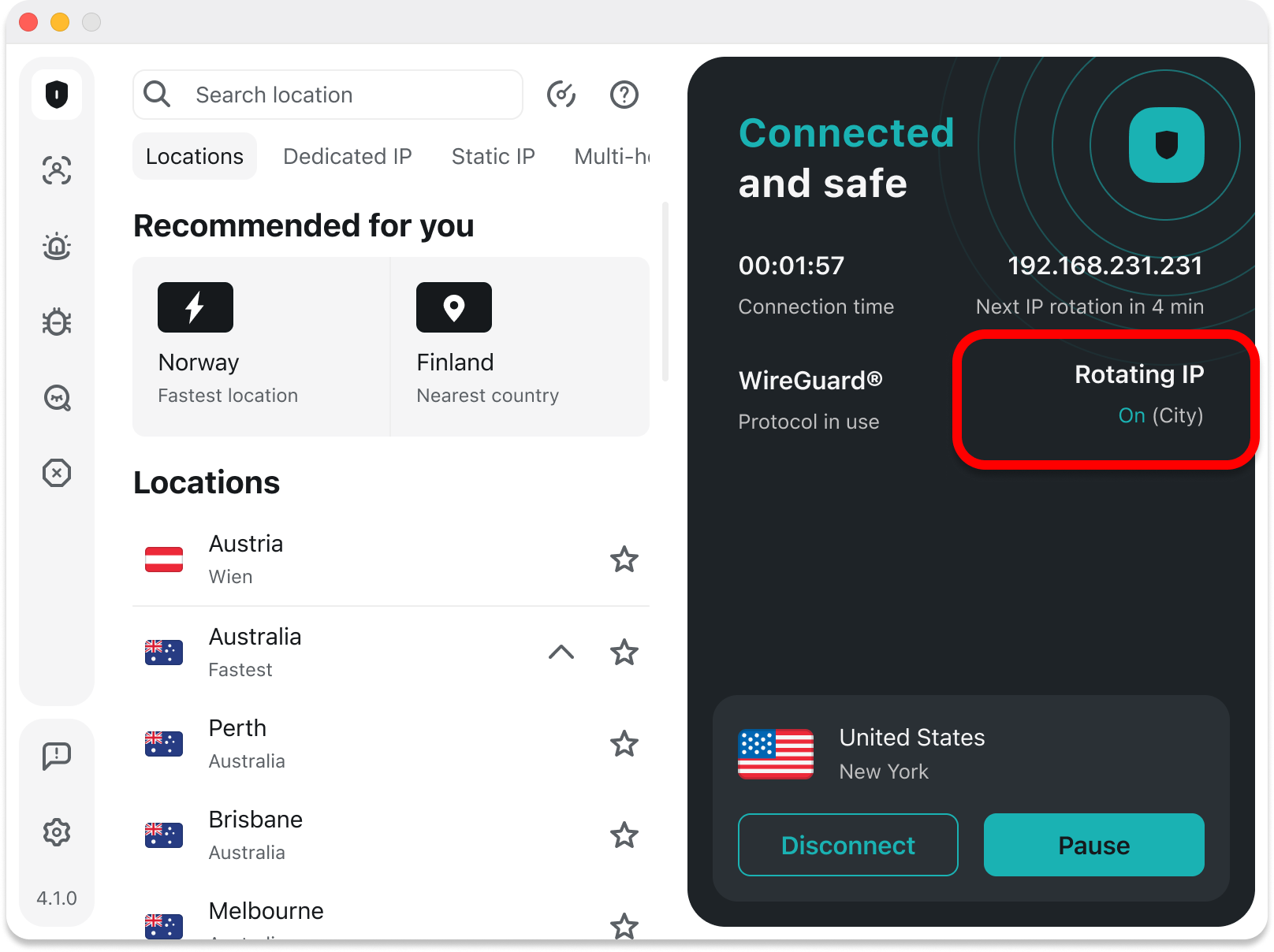 If enabled, the Rotating IP feature for macOS changes your IP address every 5 minutes within your selected city, country, region, or globally.