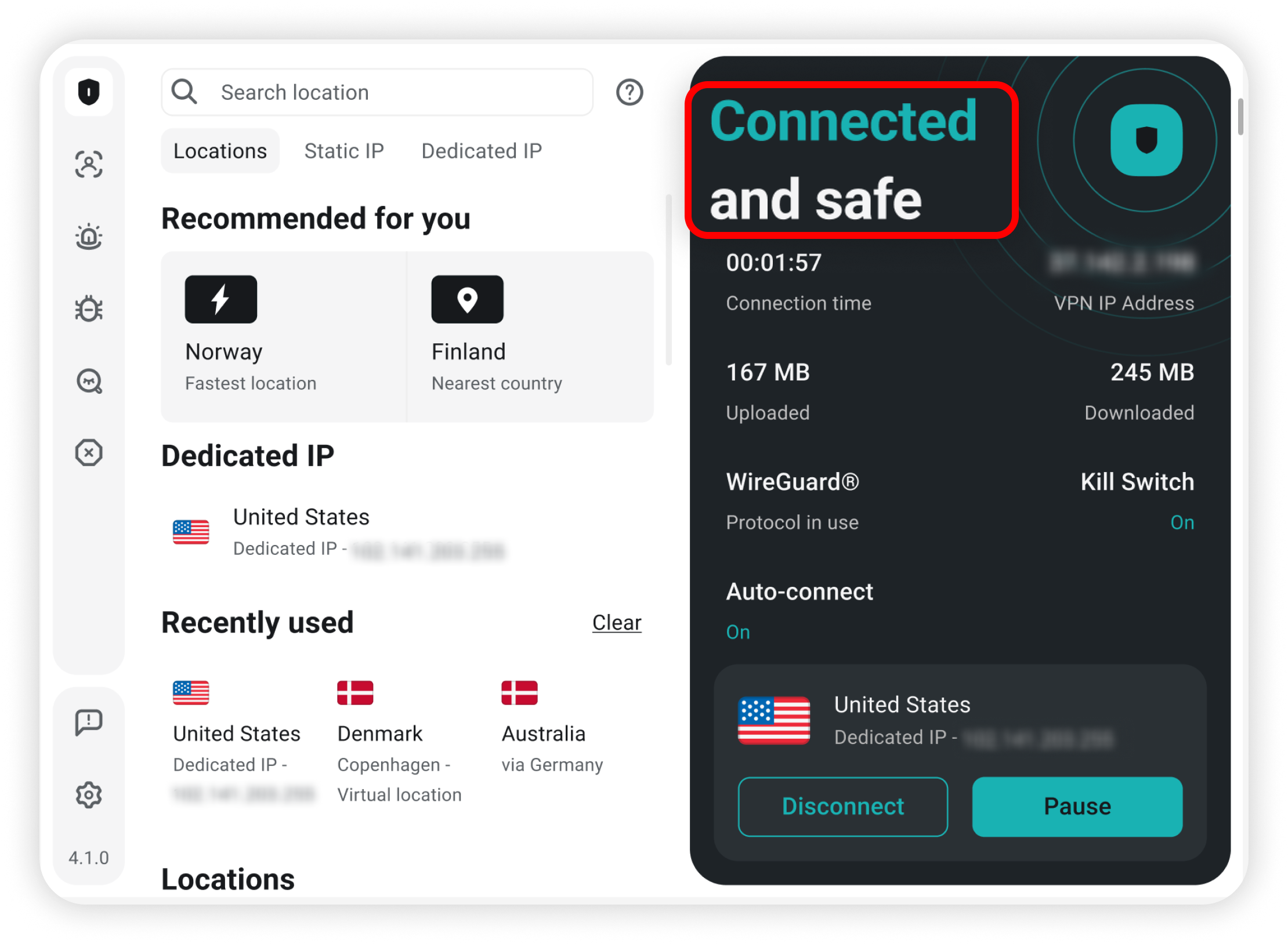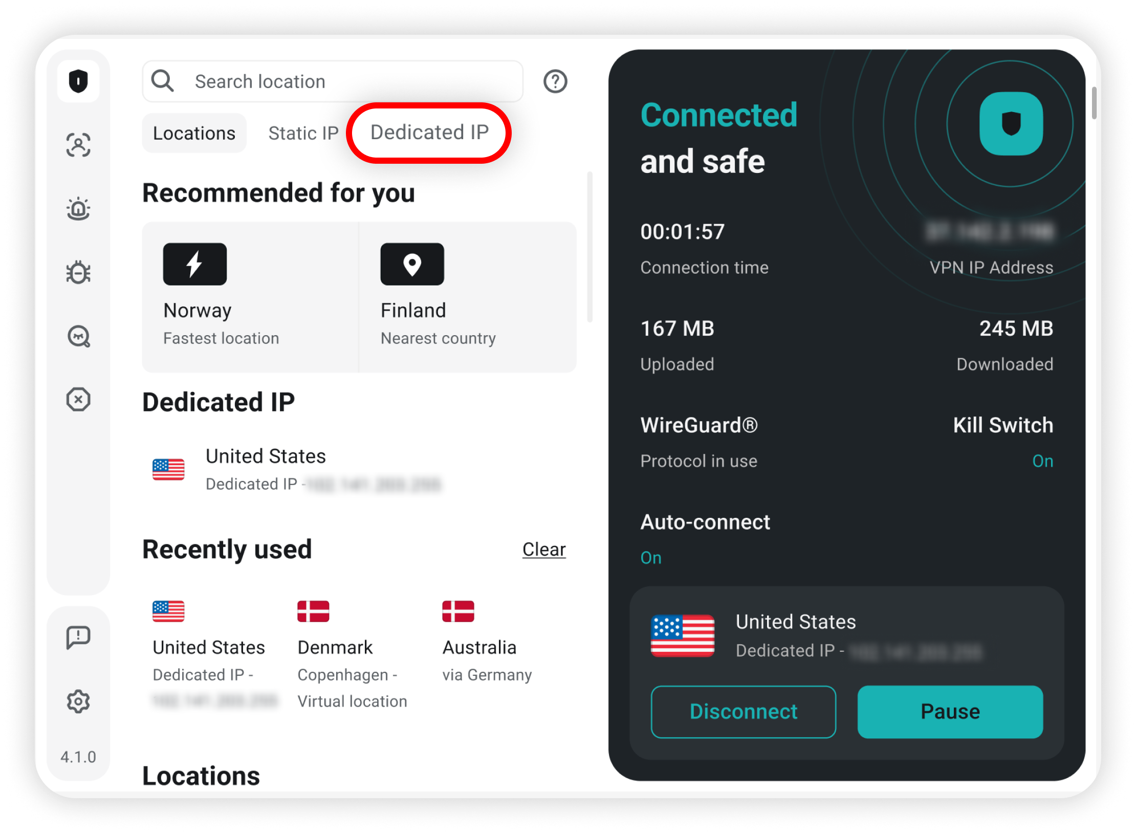 Alternatively, you can navigate to the Dedicated IP tab and connect to the Dedicated IP from there: