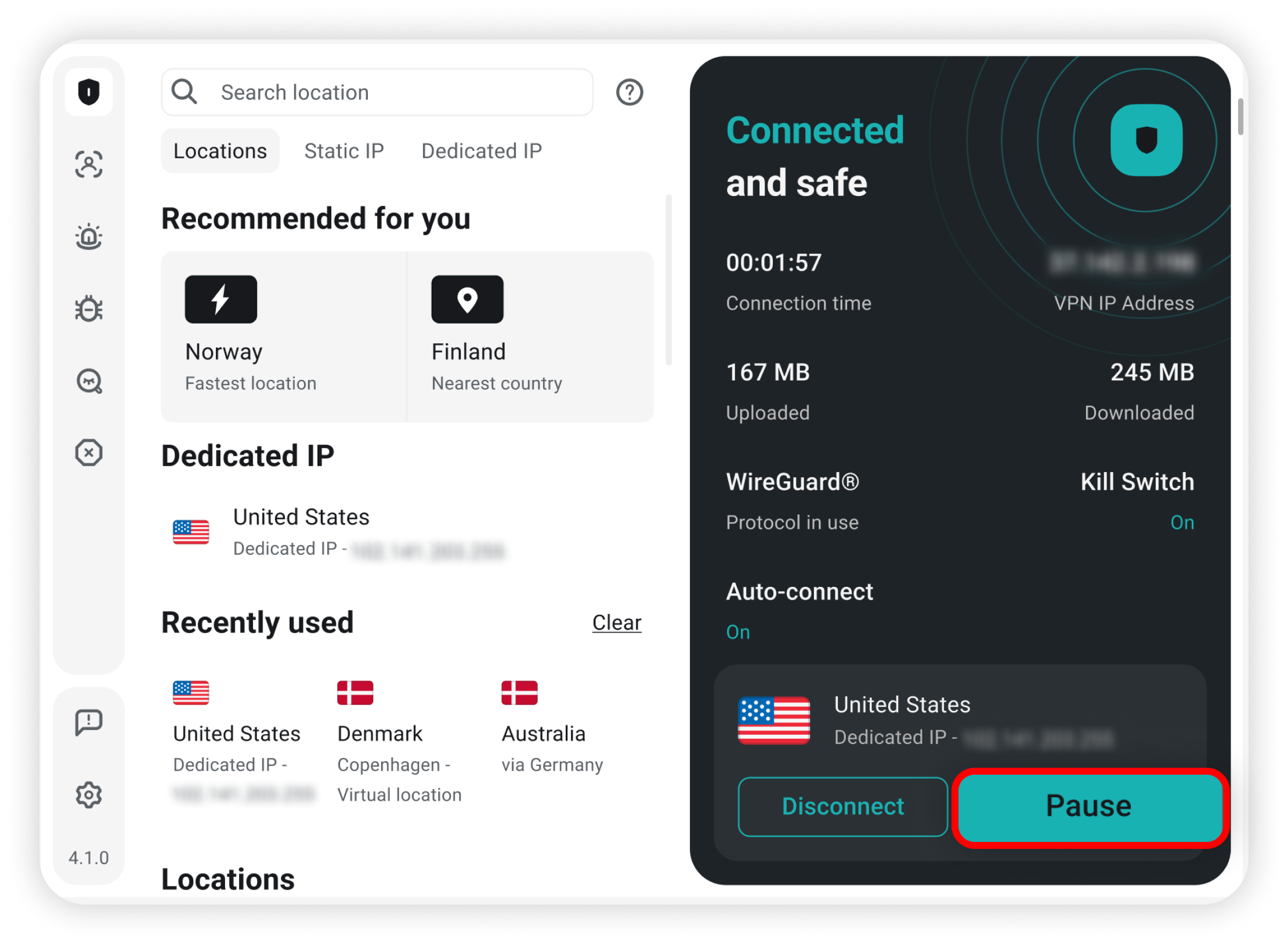Alternatively, you can also click on pause to temporarily pause the VPN connection: