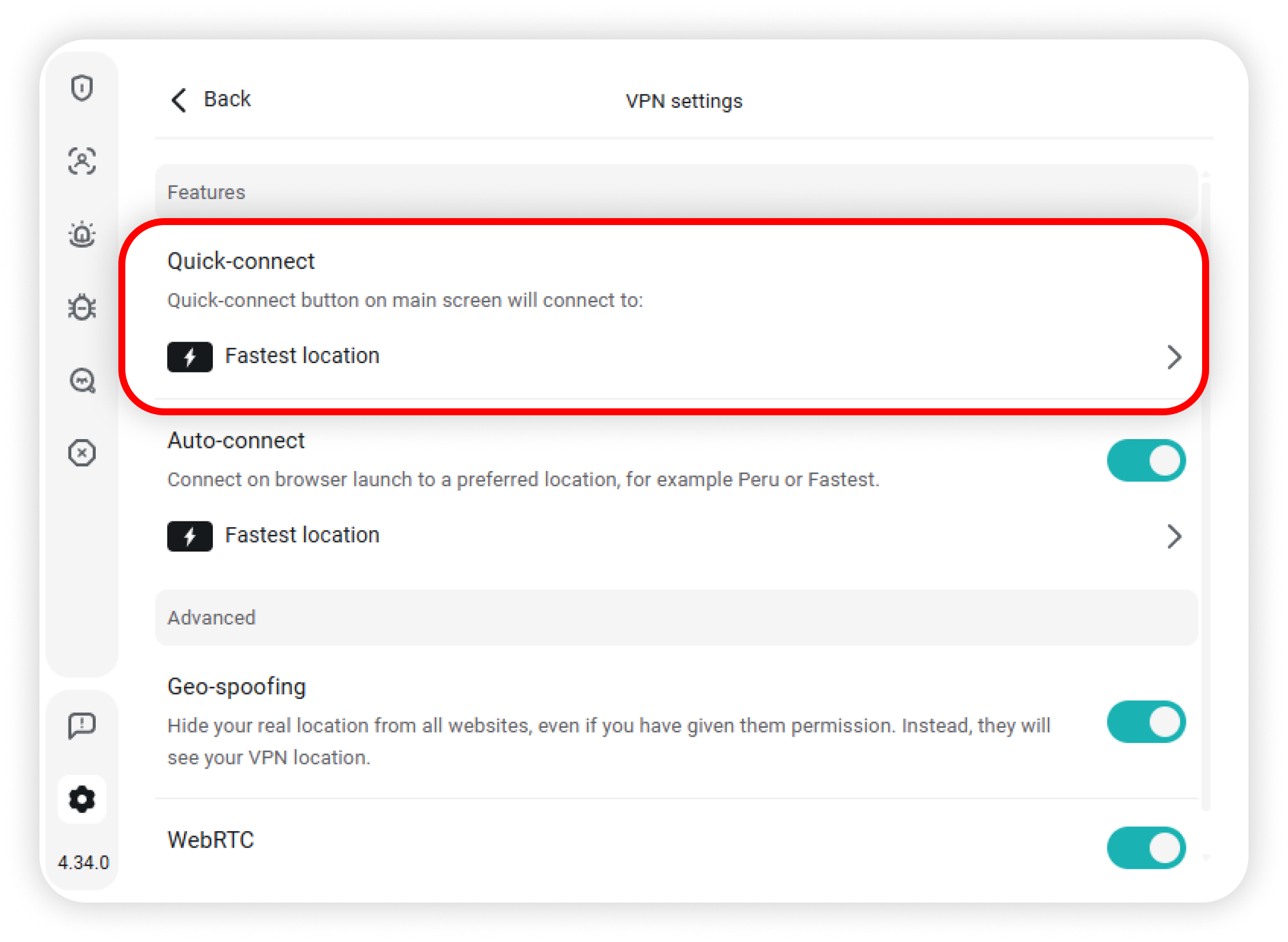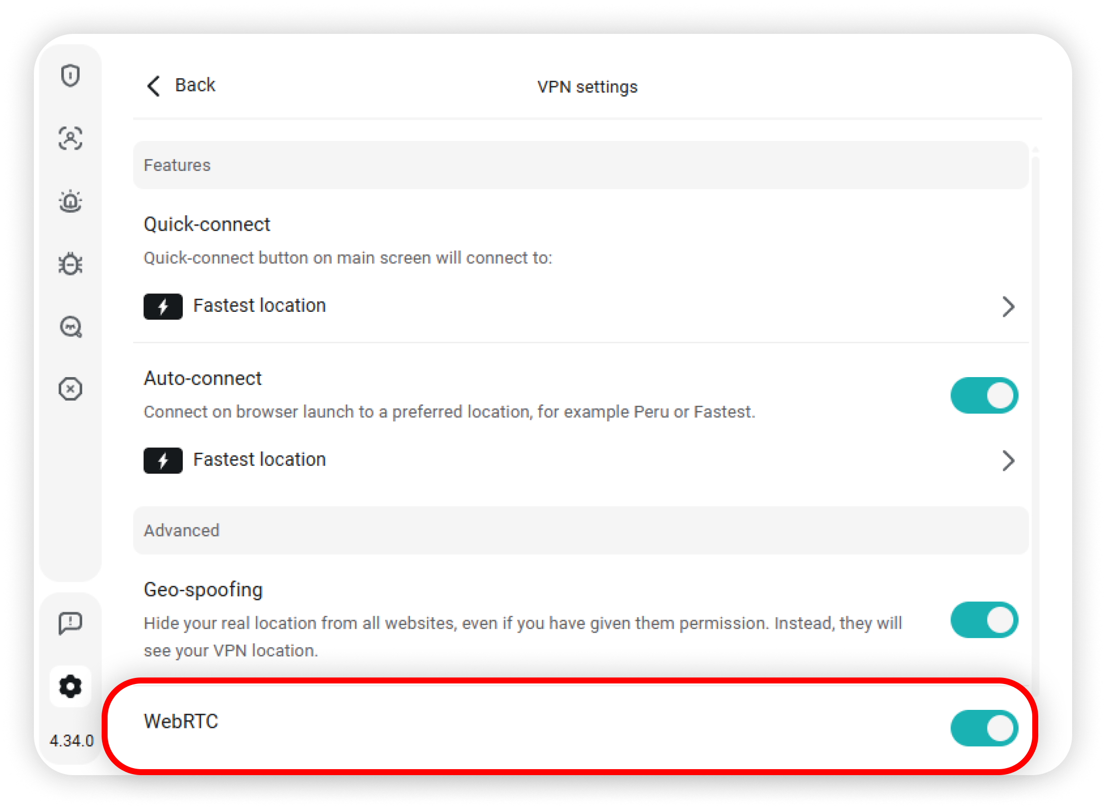 Toggle the WebRTC feature, which prevents websites from using WebRTC to discover your IP and location: