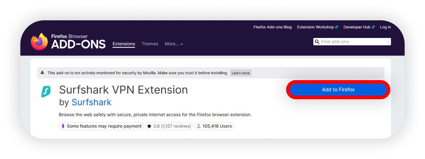 - Add the Surfshark VPN extension to your browser. You can find it by searching on the Firefox add-on store or by clicking the download link on Surfshark's website.