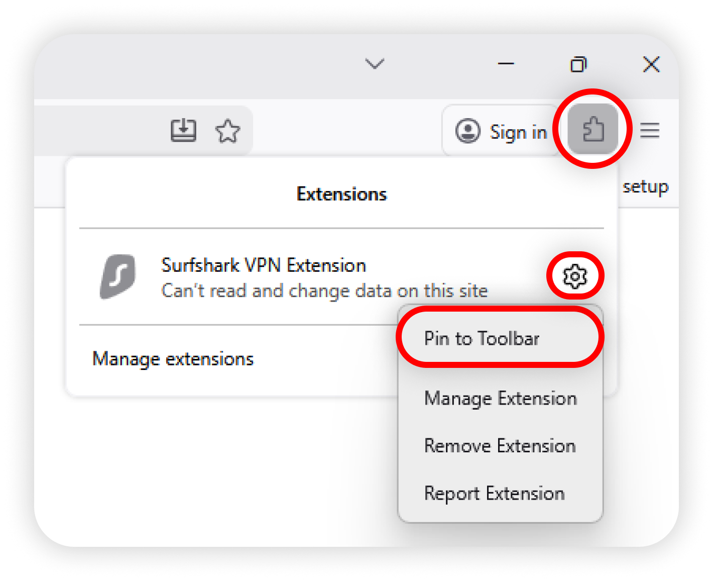 For quick access, we recommend pinning the Surfshark extension to your toolbar. To do this, click the puzzle piece icon (Extensions) in the top-right corner of your browser. Then click the cogwheel icon next to Surfshark and click the pin: