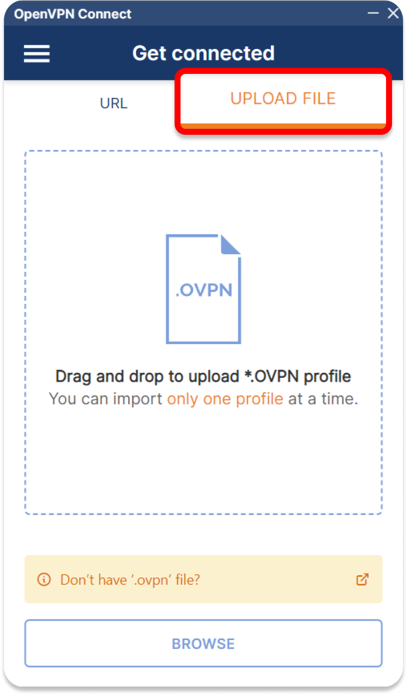 At the top of the application, select Upload File, then drag and drop the VPN location file you’ve downloaded. Alternatively, you can click browse and select the VPN location file.