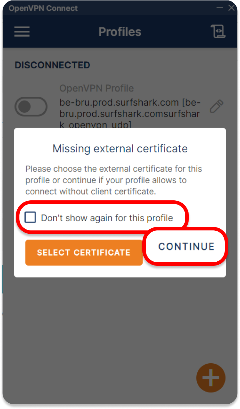 You will now be notified that an external certificate is missing. You can safely ignore this warning by clicking continue. To not receive this warning again, tick the don’t show again for this profile box.