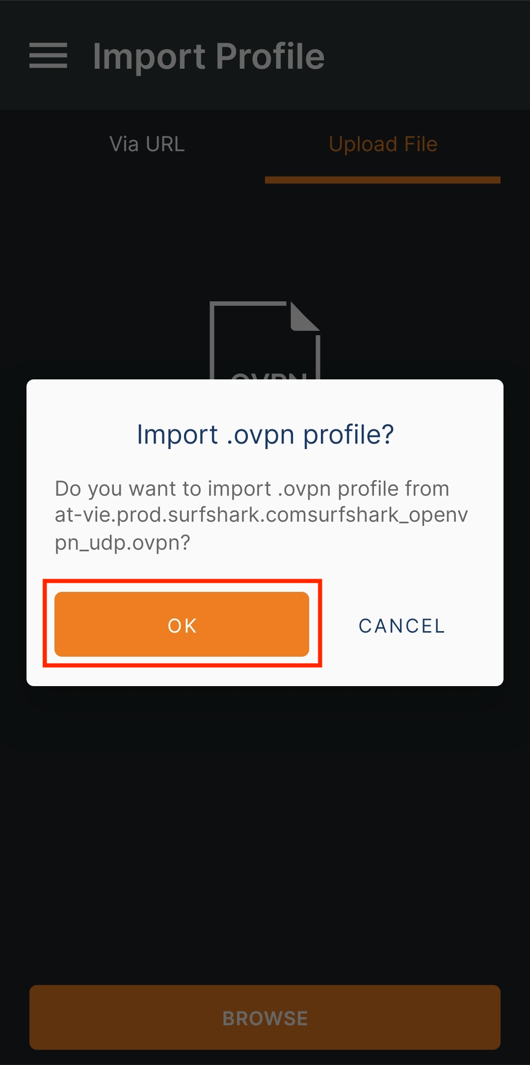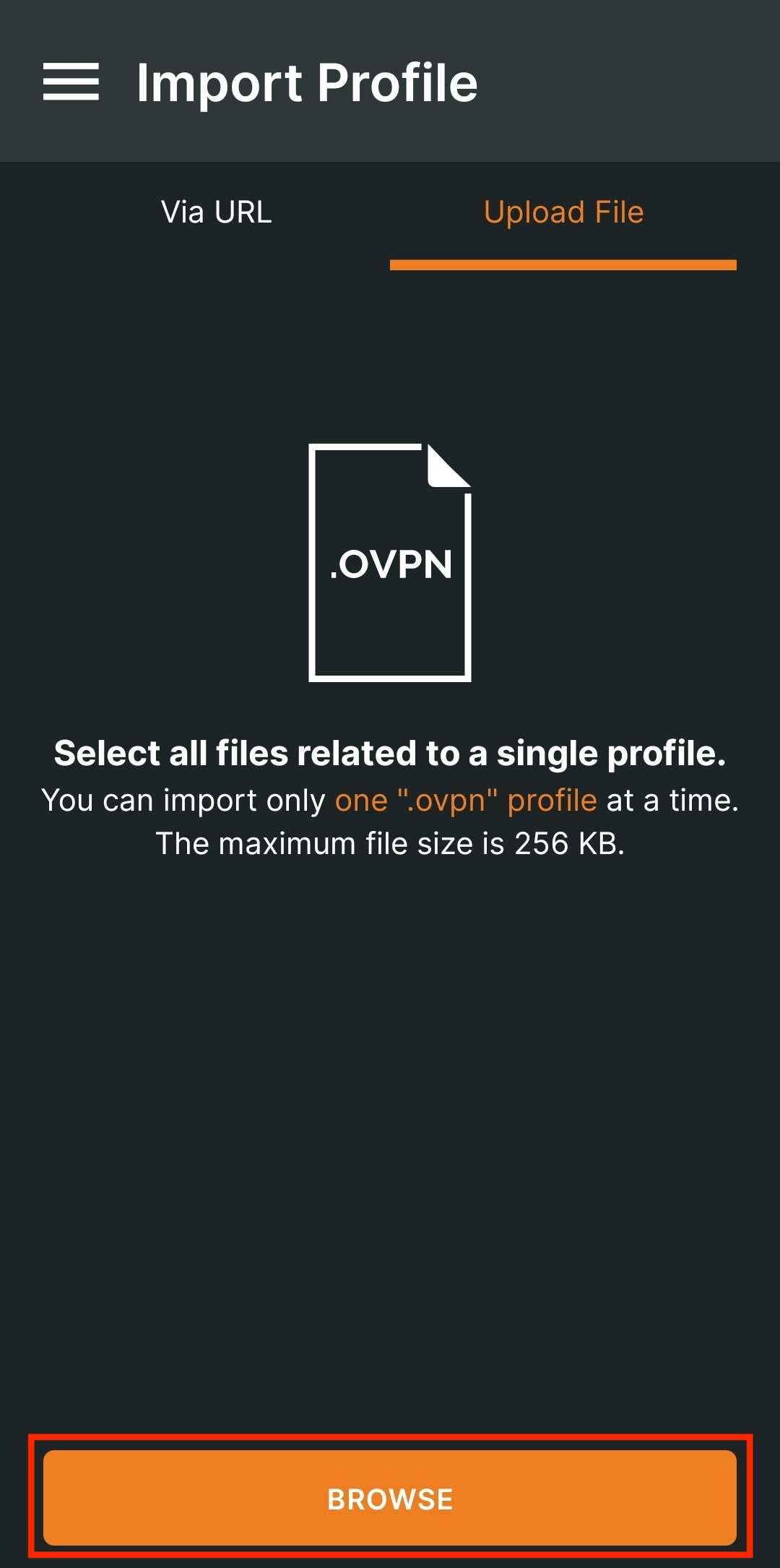 - You need to upload your configuration file (refer to the Download configuration files in this article). To do so, switch to the UPLOAD FILE tab and tap on BROWSE.
