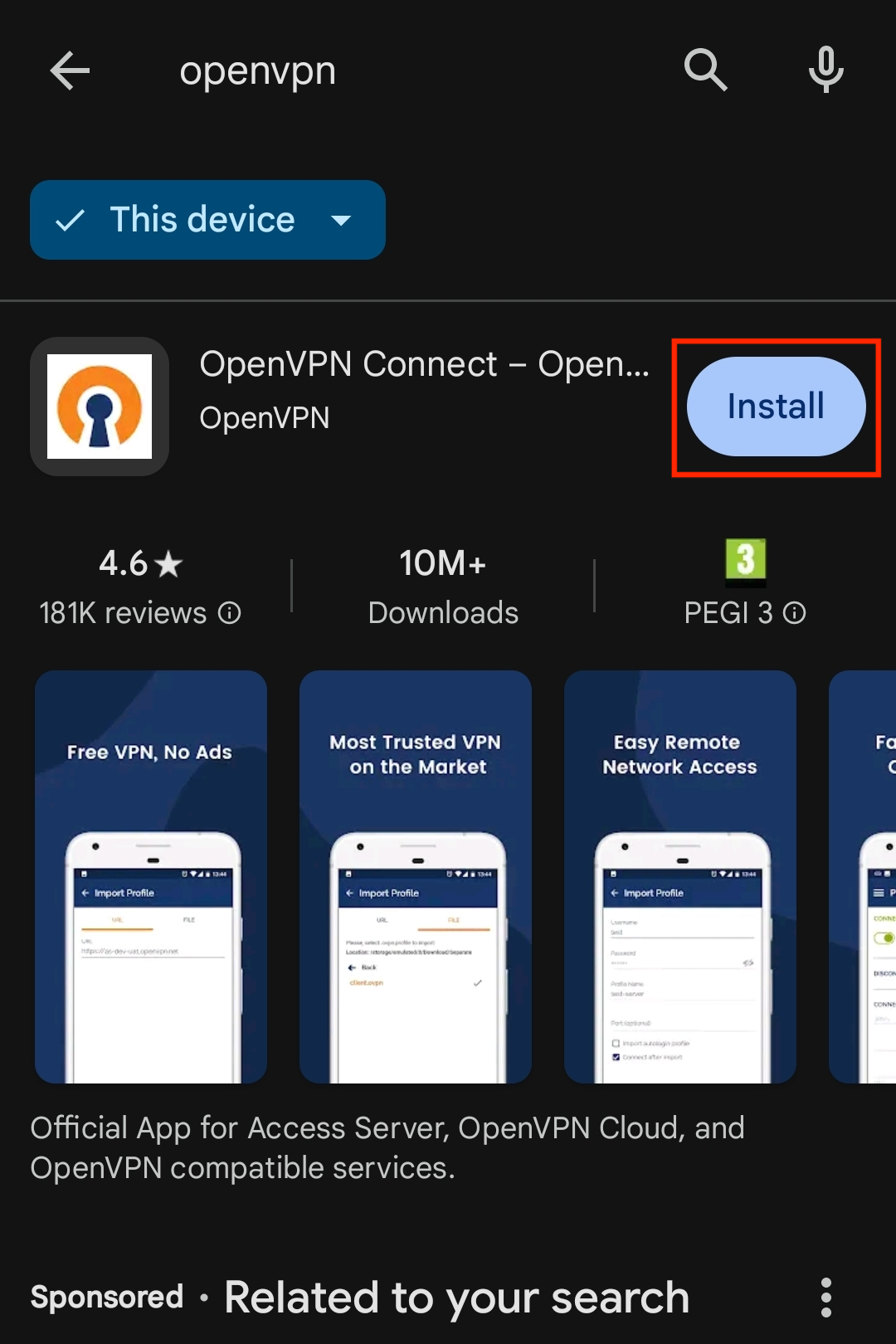 - You may find several different apps for OpenVPN. We used the one you can see in the picture below. Press the Install button.