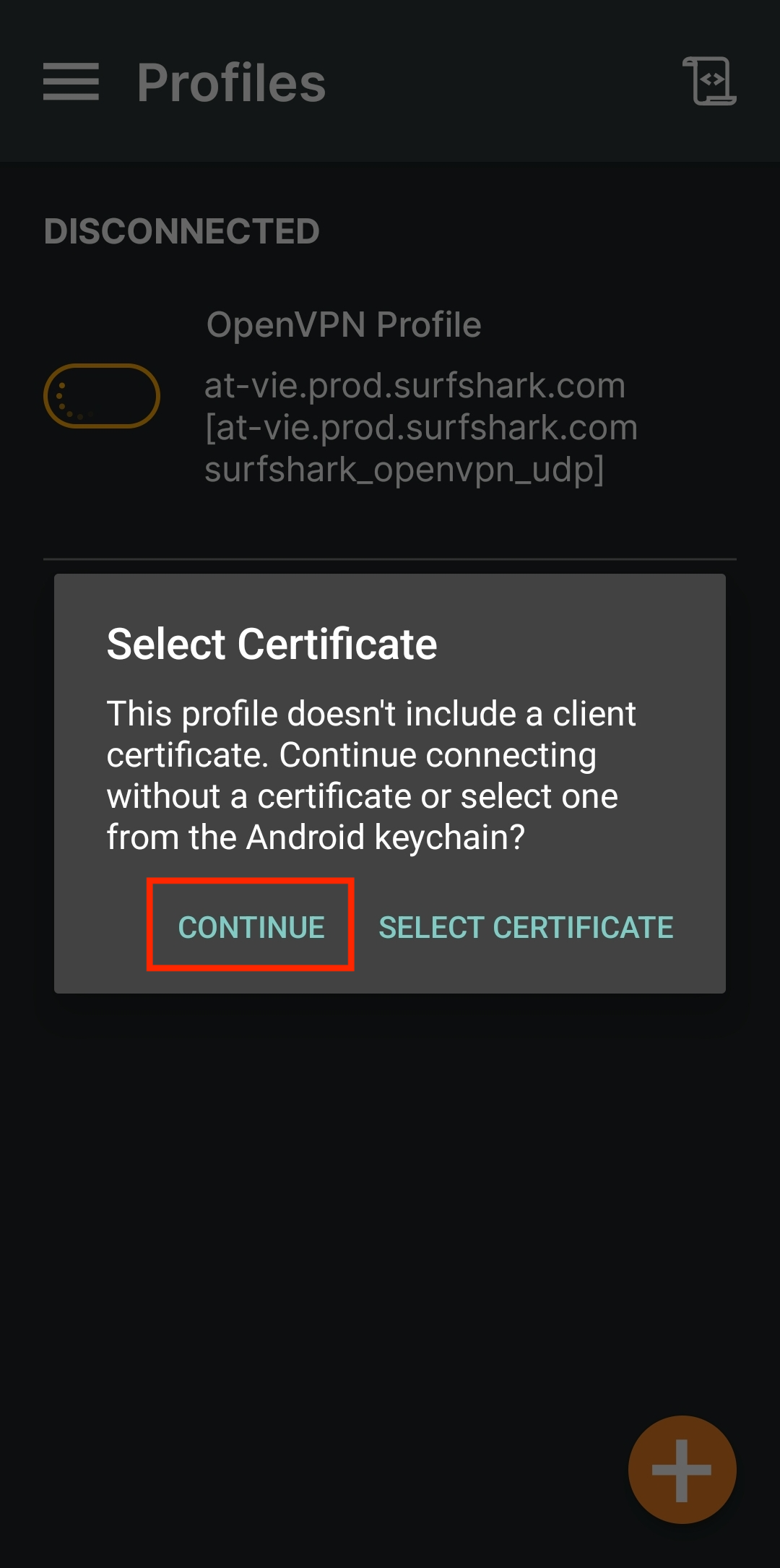 You may get a pop-up informing you about the certificate. The certificate in included in the configuration file, so click CONTINUE.