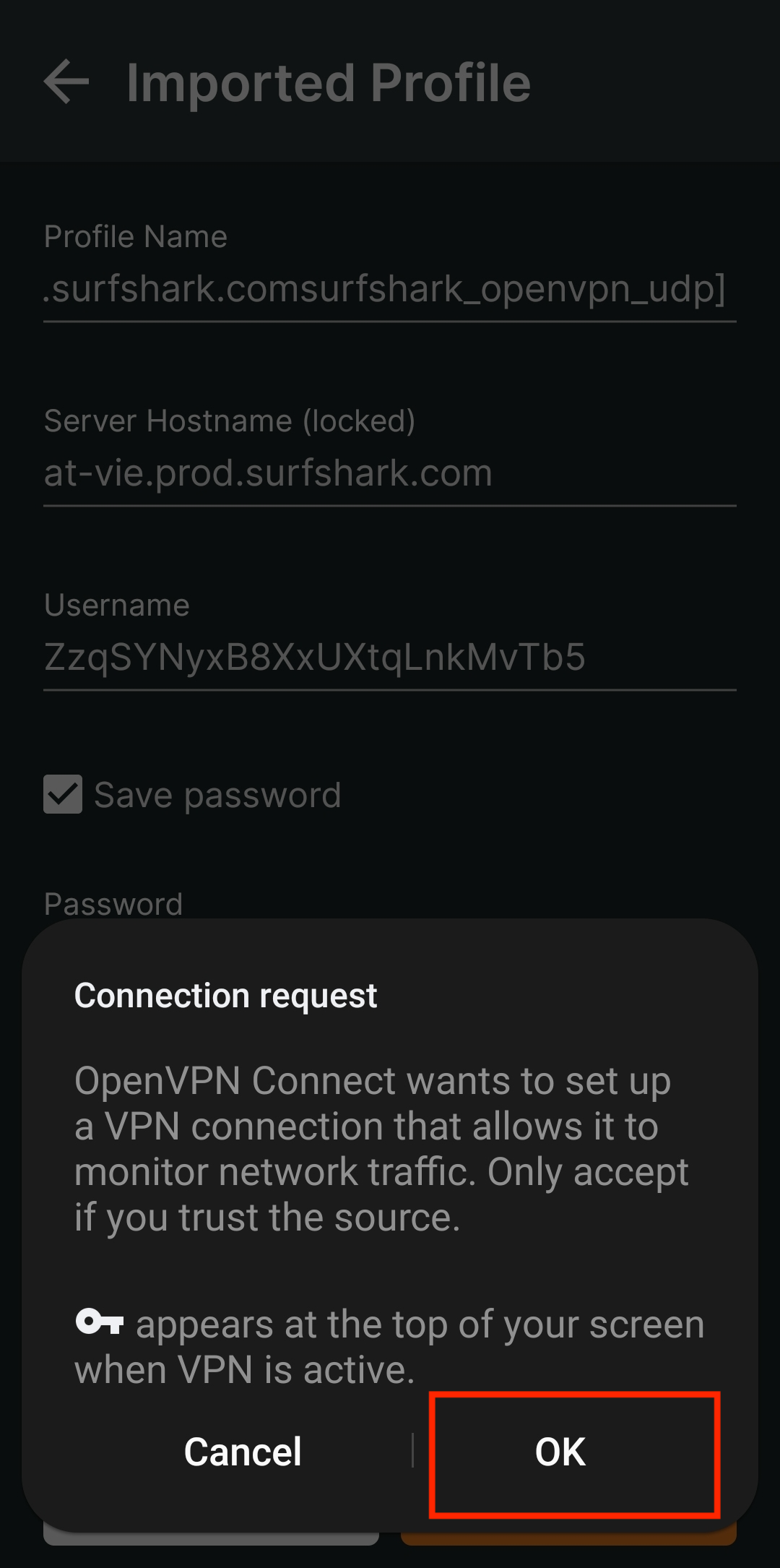 When connecting for the first time, you will see a request to set up a VPN connection. Without your permission, the OpenVPN app won't be able to make a VPN connection. Click OK.
