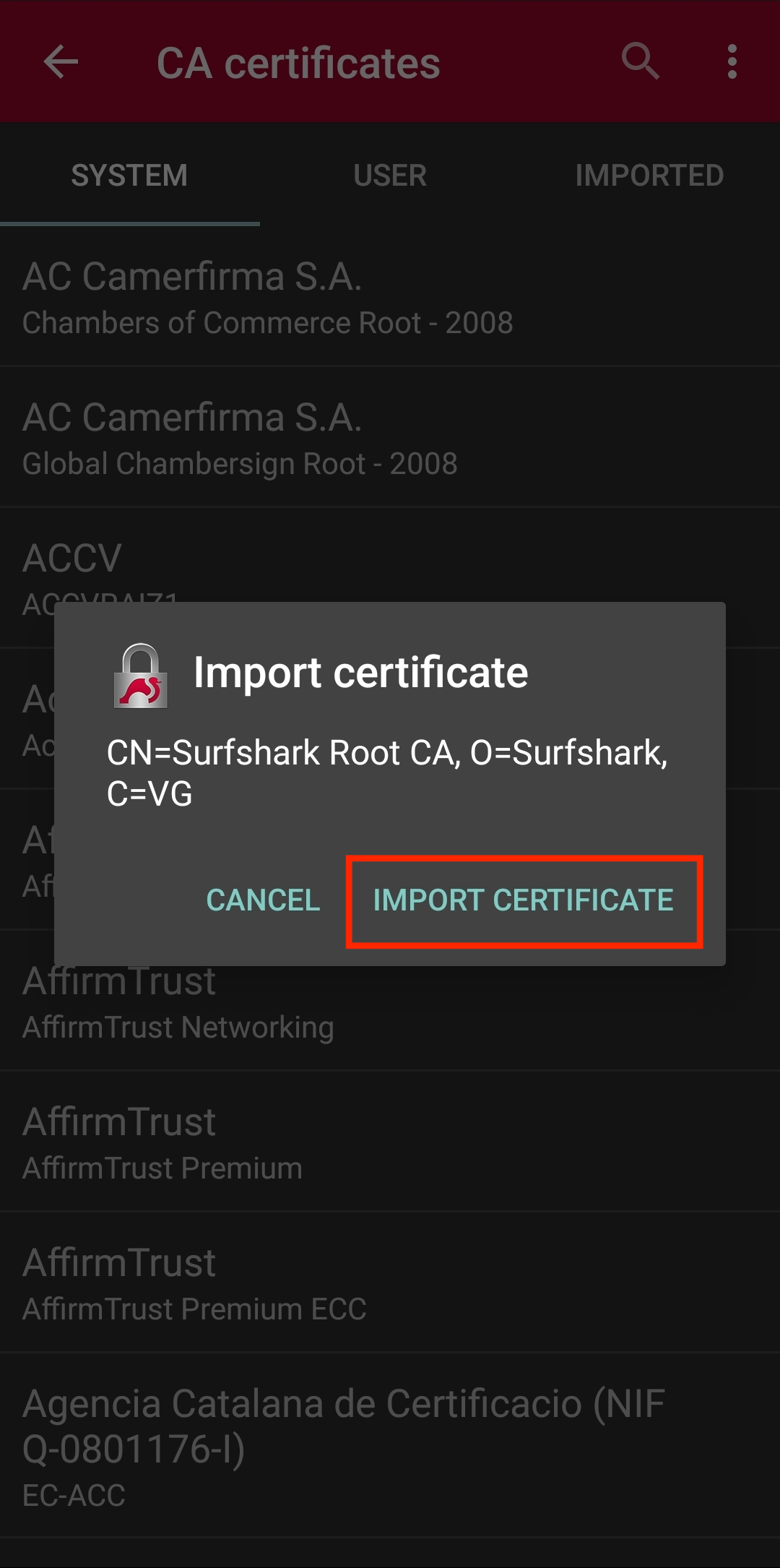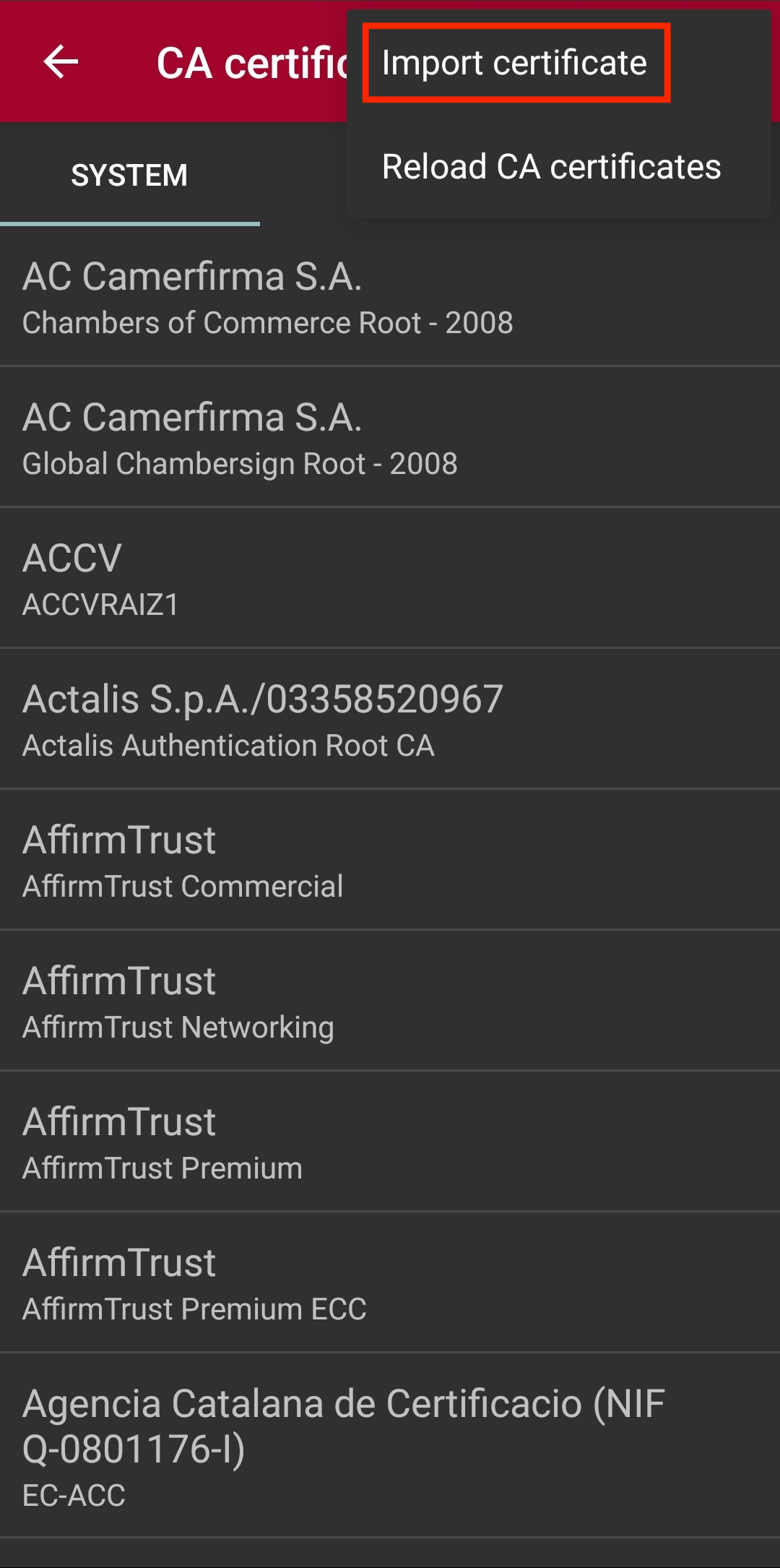 7. A pop-up will appear asking for your permission to import the certificate. Tap Import certificate. Once you receive a message that the certificate was successfully imported, tap the arrow on the top-left corner to return to the main screen.