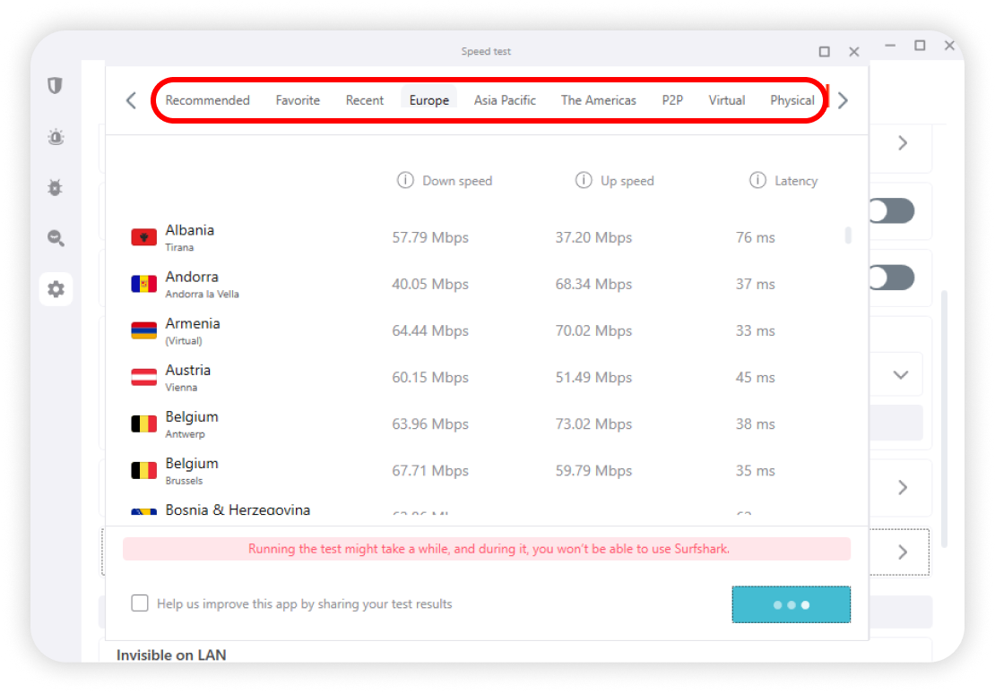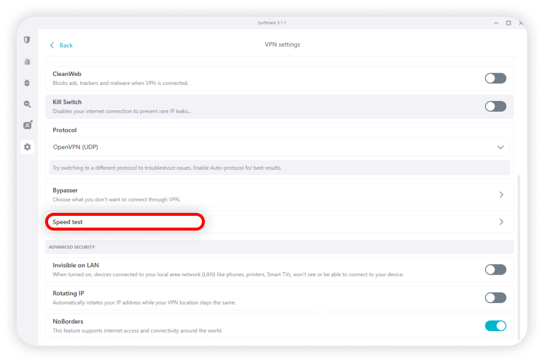Running a speed and latency test will help you choose the best server to connect to. You can find Surfshark’s built-in speed and latency test at settings > VPN settings > Speed test:
