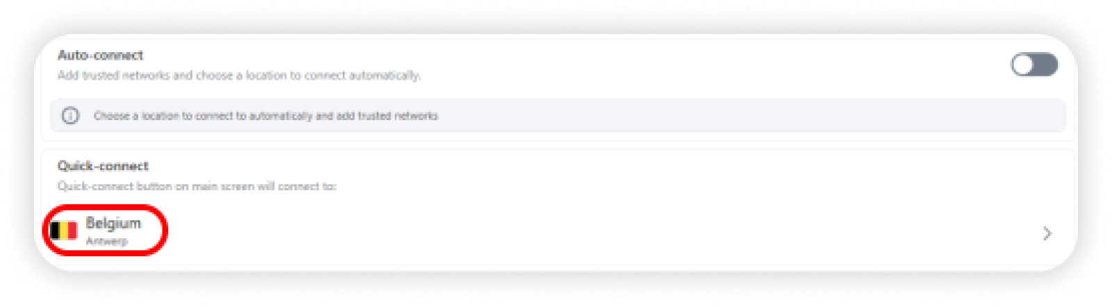 The second way to change your preferred connection location is to go to the settings > VPN settings > quick-connect. Once you click on it, you'll find a list of locations to choose from, along with the nearest and fastest ones.