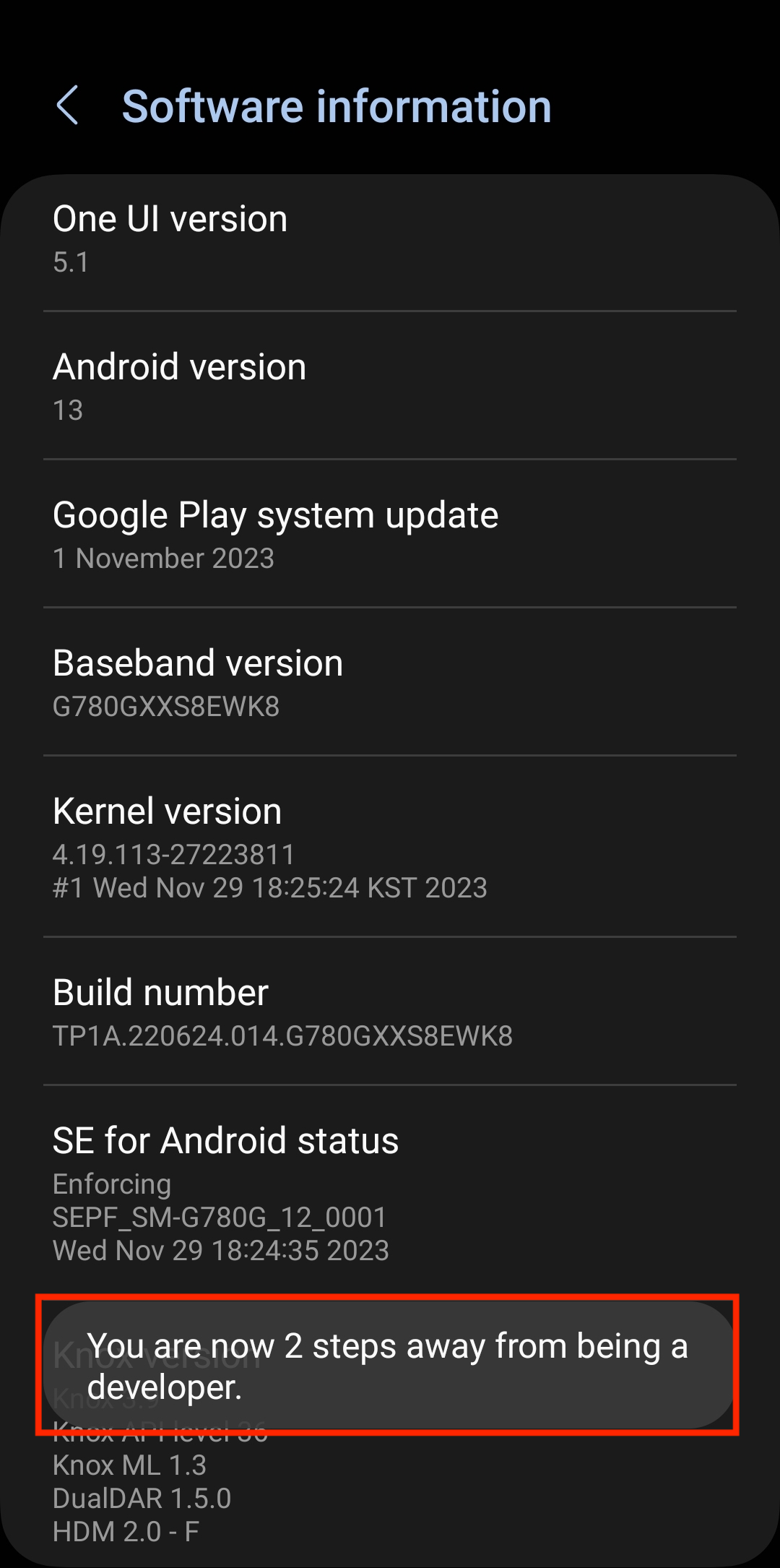- Locate the phone's build number and tap on it multiple times until you see a message regarding developer options and how many times you have to tap to enable it. On Samsung devices, you need to tap on Software information.