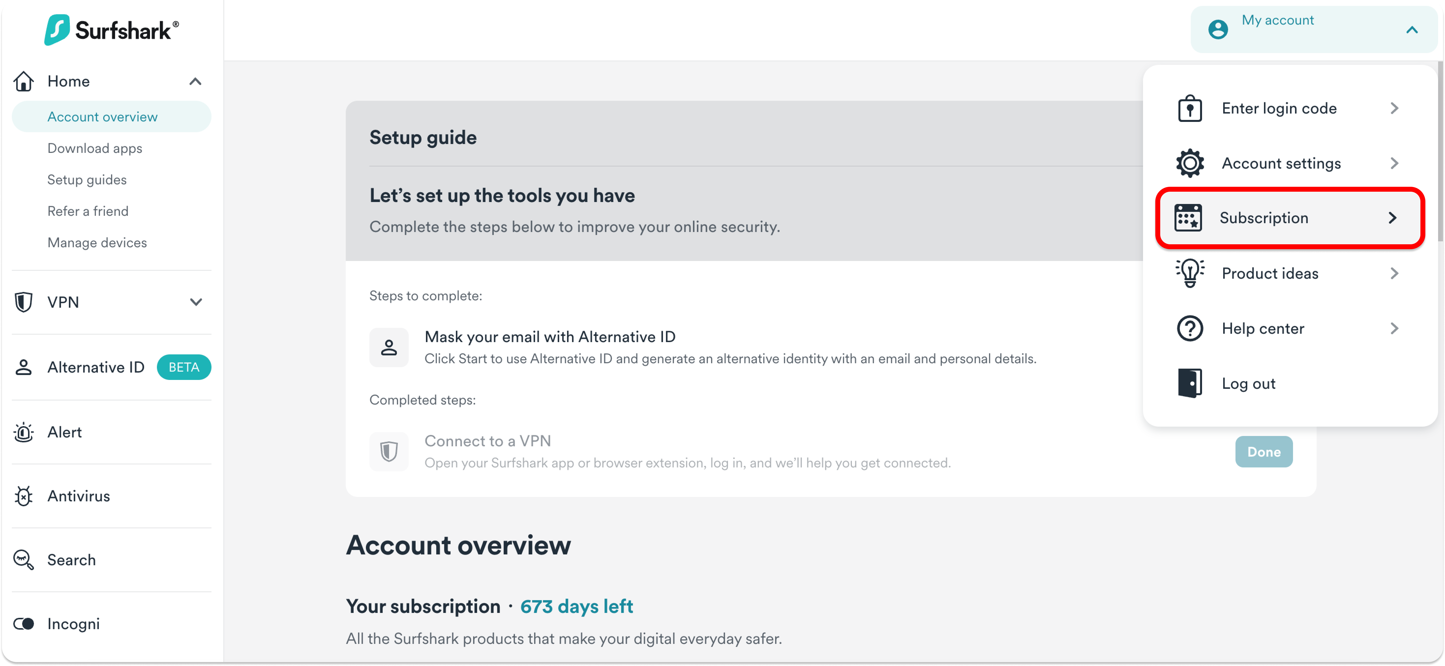 On the top-right corner, click on your account and select Subscription.