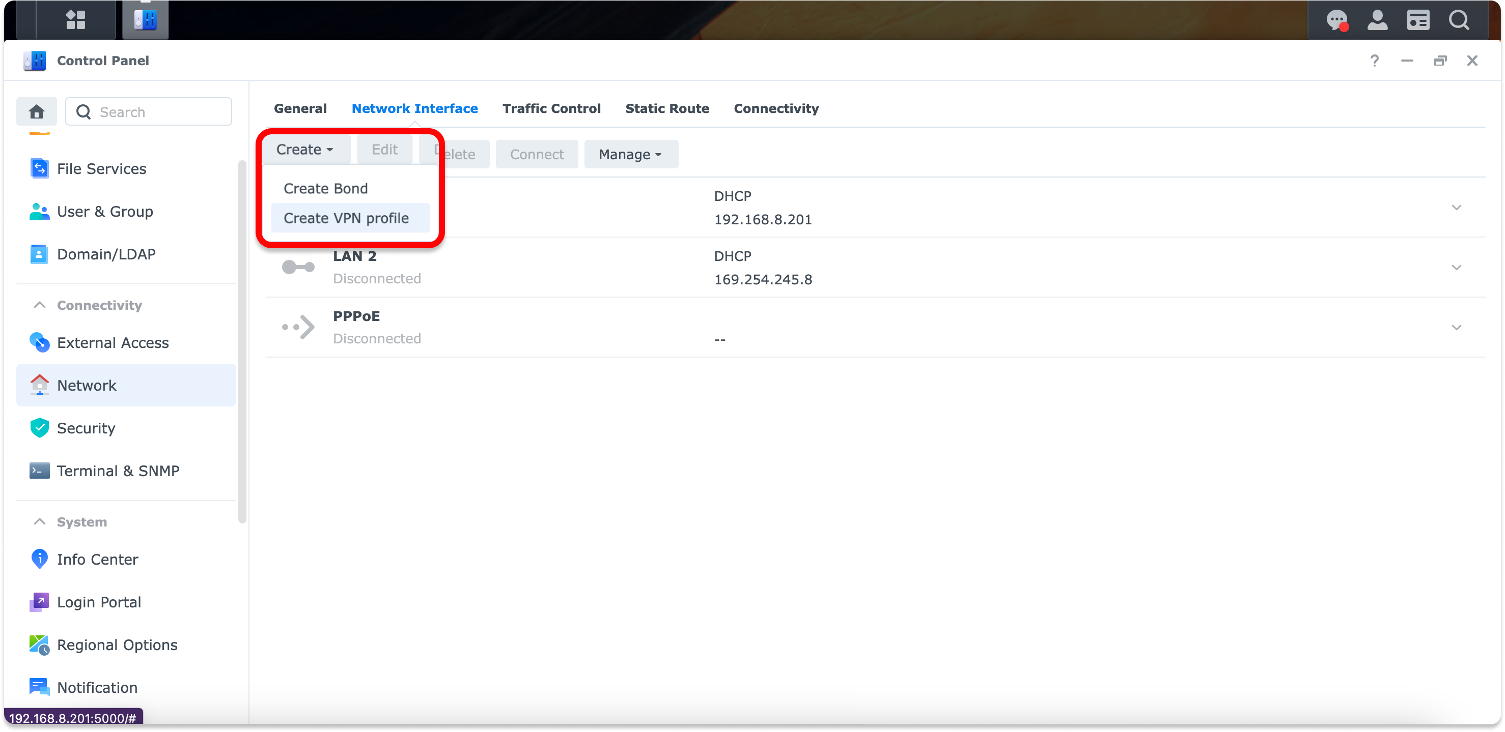 3. Navigate to Network interface > Create > Create VPN Profile.