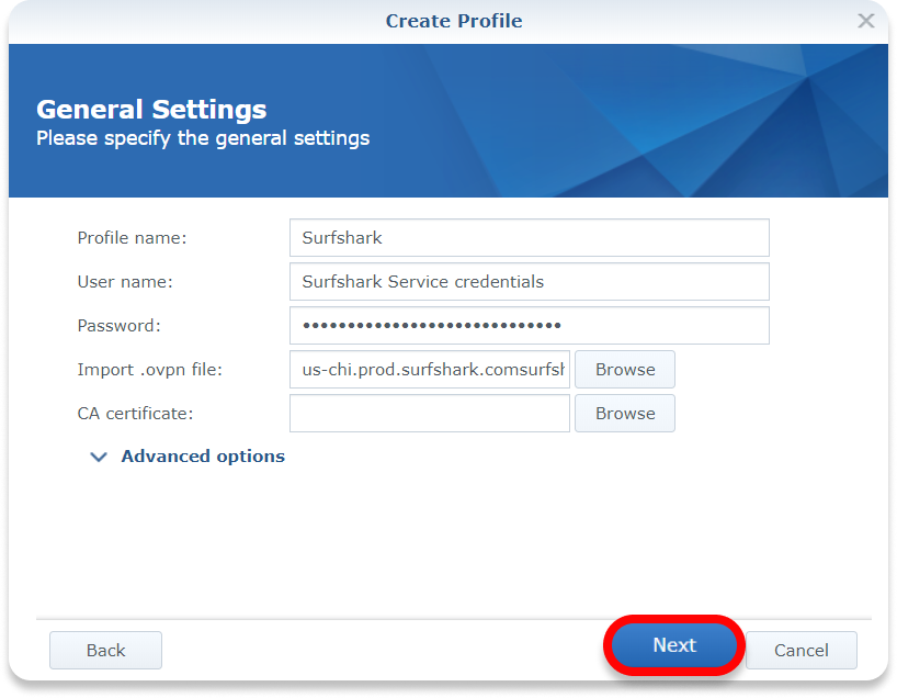 Password: Surfshark service password (refer to Get your credentials section in this article)