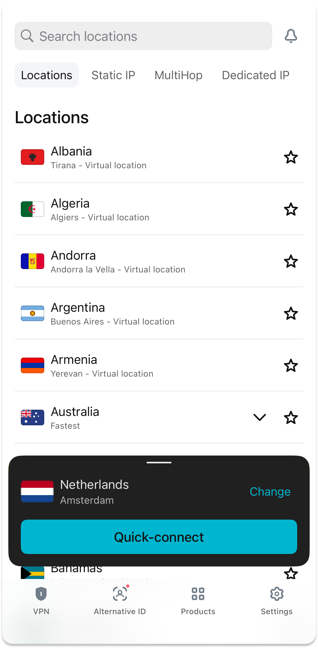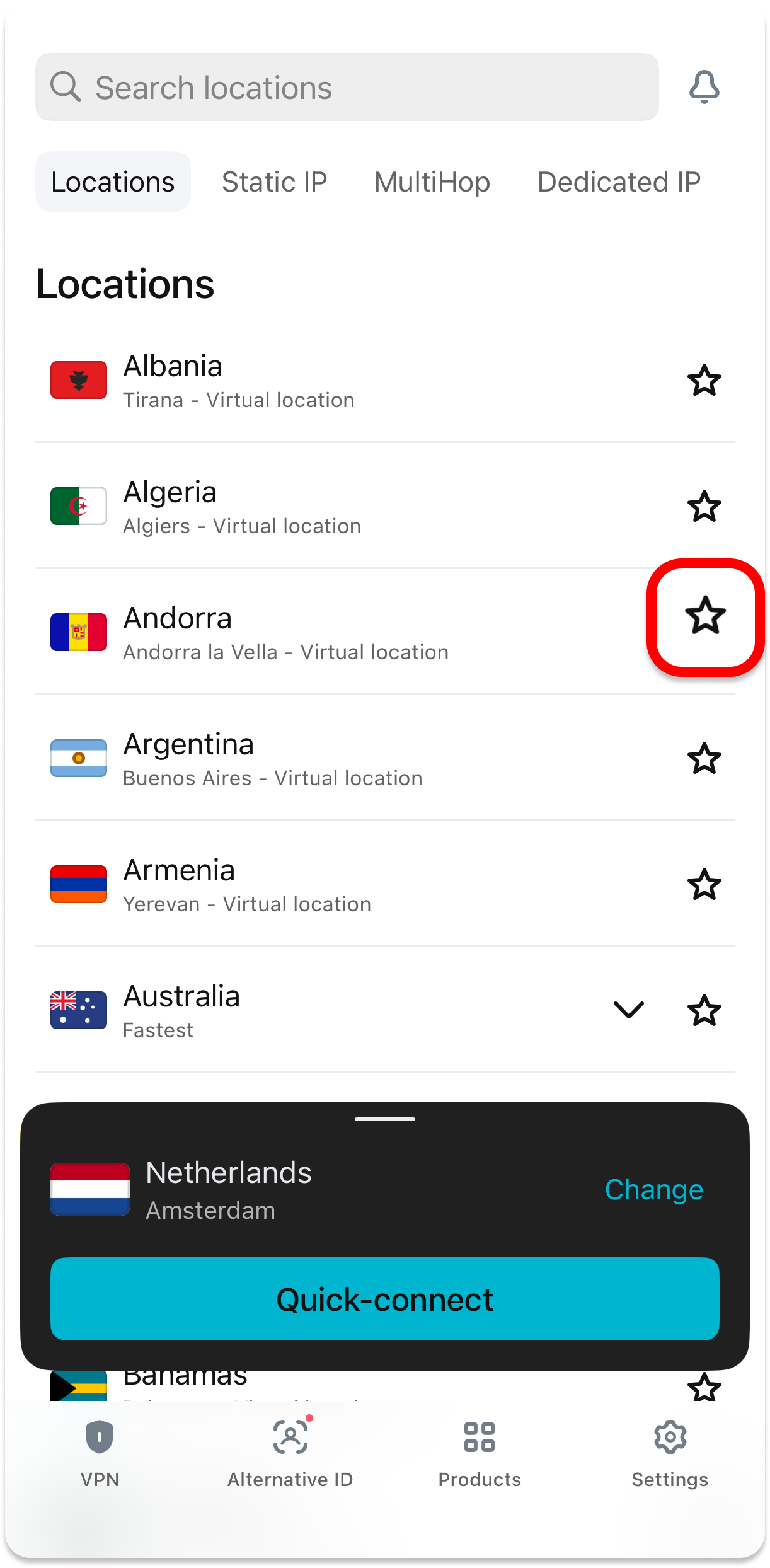 Choose between the fastest, the nearest server, or any location of your choice. Your quick-connect location will save automatically: