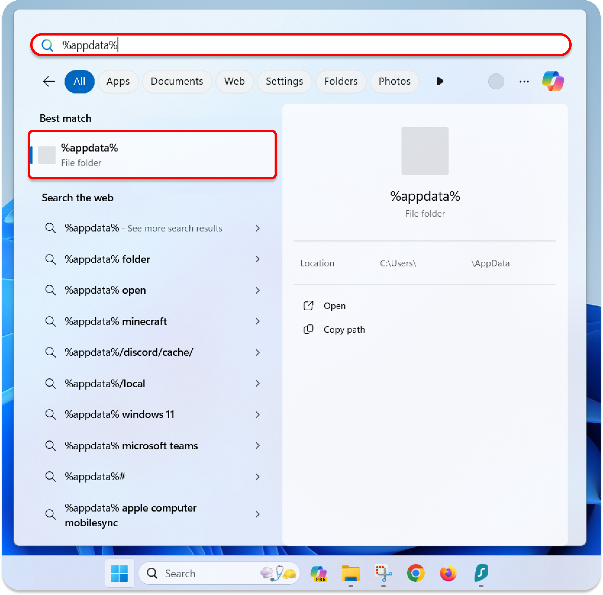 1. Click the Search icon on the Windows start menu and type in %appdata%. Click on the first result, which looks like the one in the image below.