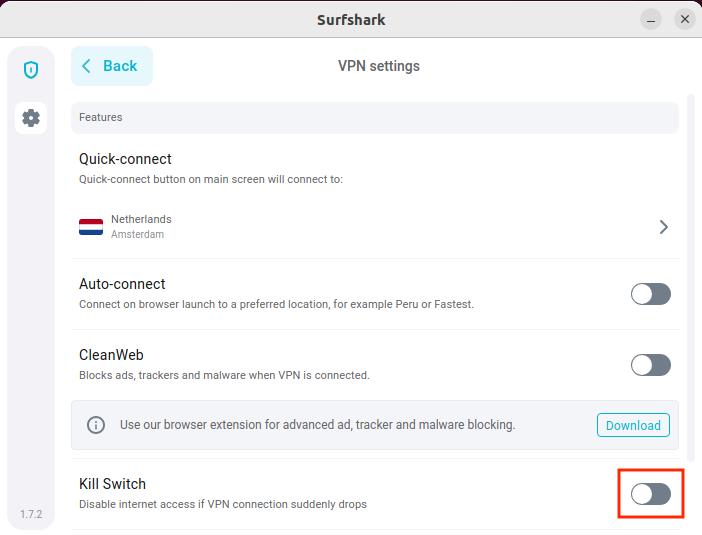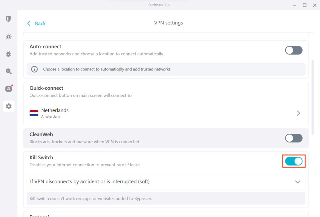 So, if you unexpectedly disconnect from Surfshark, Kill Switch will ensure that no sensitive data is leaked by cutting off the internet connection until you safely reconnect to a Surfshark VPN server.