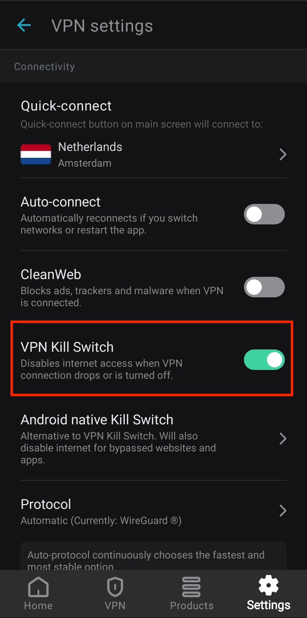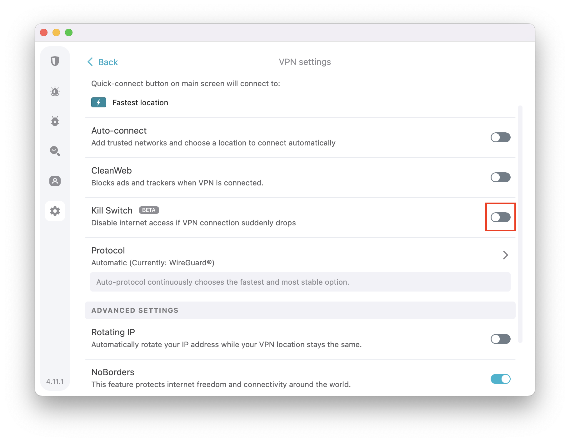 To enable Kill Switch, toggle the switch on the right side. If you open the VPN Settings and see that the switch is green, the feature is already on.