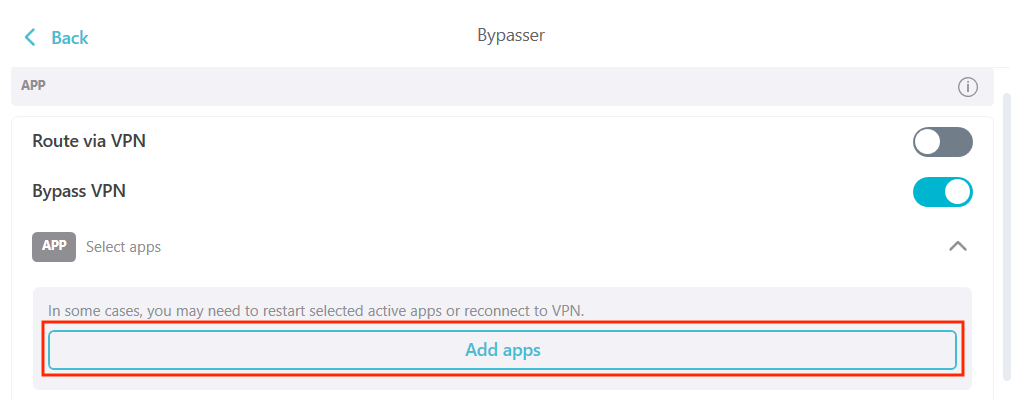 Bypasser is a feature that allows specific apps & websites to route via or bypass the VPN tunnel.