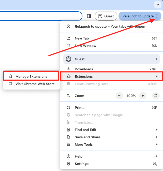 - Click on Extensions, then select Manage Extensions.