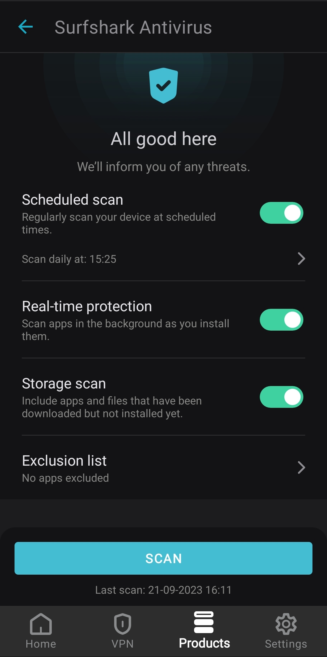 Exclusion list – you can select apps that are not affected by the Antivirus scans.