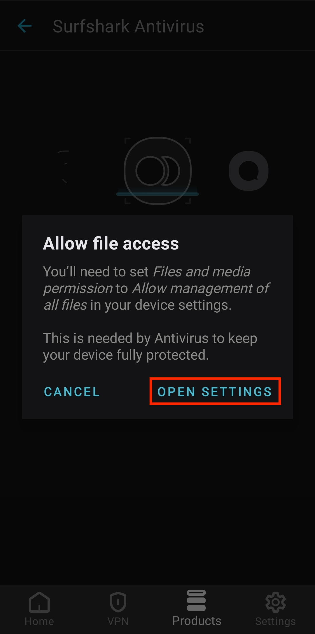 In the next pop-up, you'll need to allow file access to the Surfshark Antivirus. To do so, tap Open Settings.