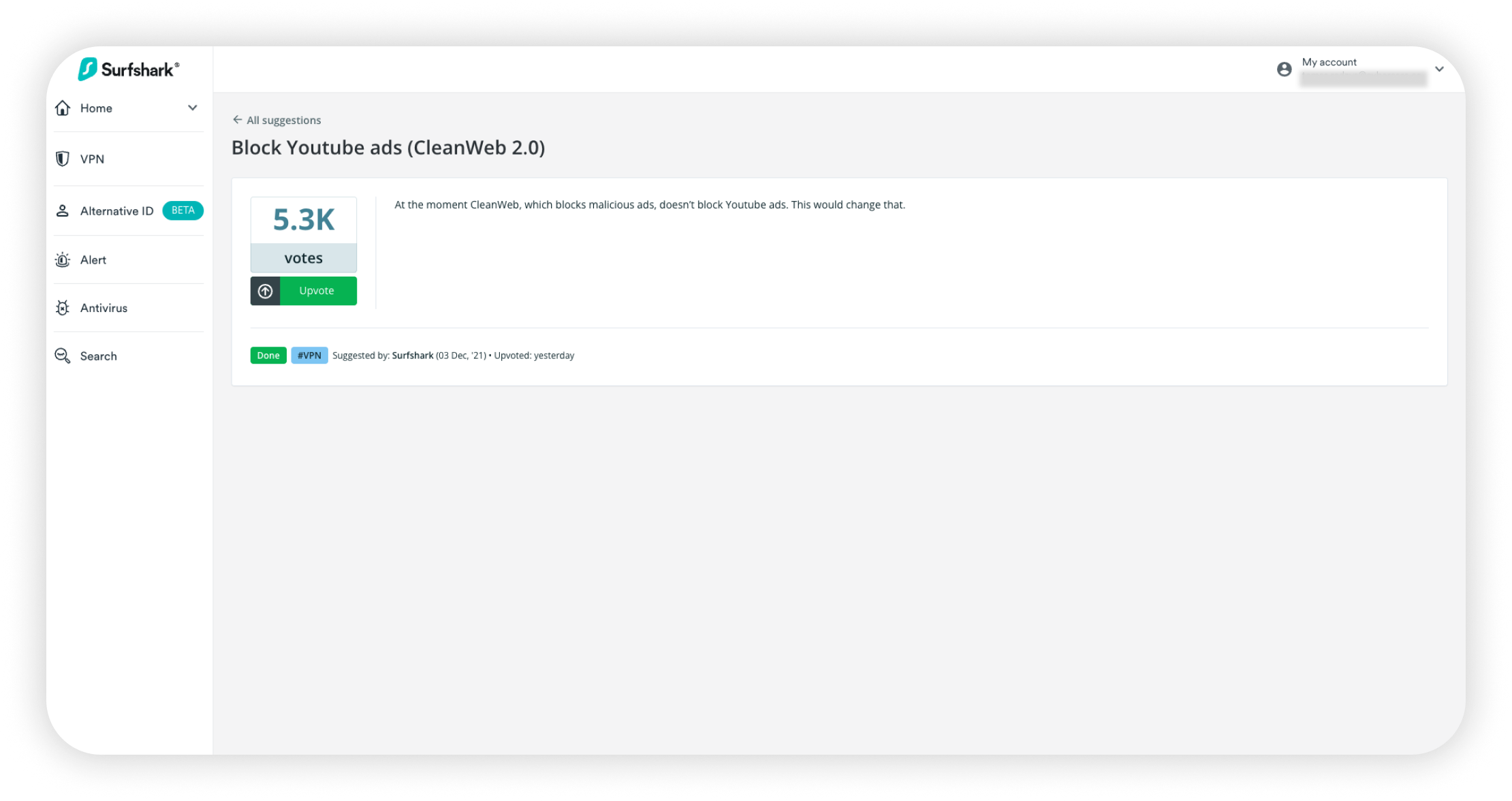 Your feedback is important to us and allows us to develop better and stronger features. As a result, to make this process smoother and faster, we have the Surfshark Product Ideas feature. This article shows you how to use it to either vote on your favorite suggestions for new functionalities and improvements or to submit a brand-new idea yourself. It's your chance to help steer the future of Surfshark and ensure we're building the best possible tools for your online privacy and security.